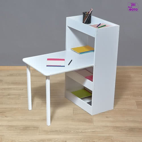 - Встроенные полки позволяют удобно хранить тетради, книги, органайзеры и декоративные коробки для порядка.