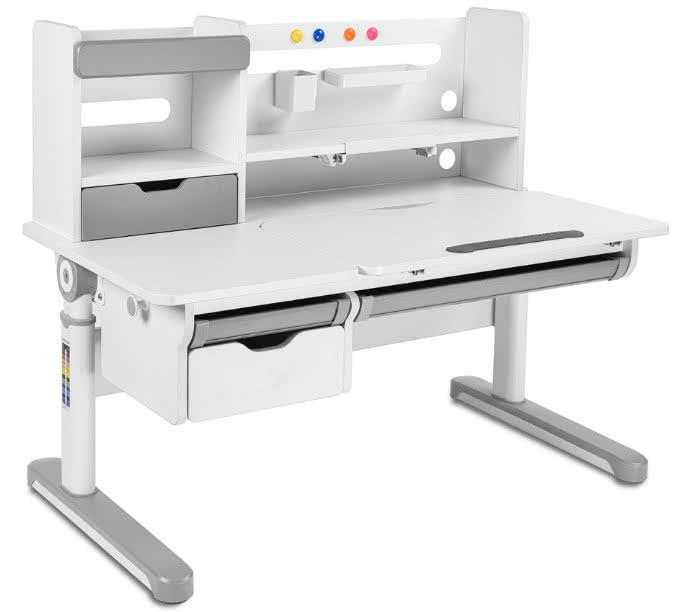 Эргономичная, растущая парта с вместительной надстройкой. Надстройка включает в себя один выдвижной ящик, три полки, выдвижную подставку для книг, и специальные отверстия для крепления аксессуаров.