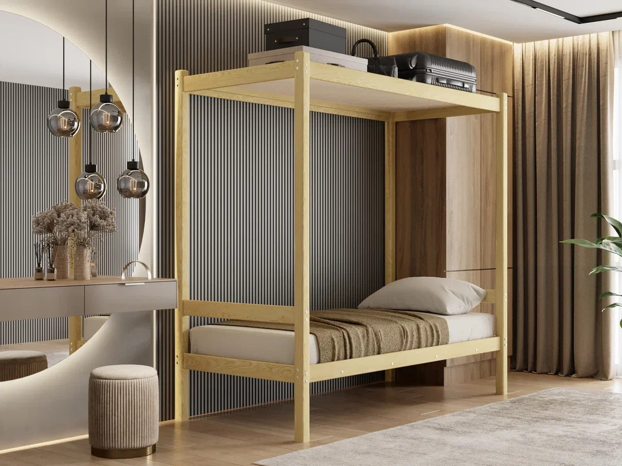 Кровать Green Mebel Сейвер — функциональное решение для компактной организации пространства в спальне, детской, гостевой комнате или на даче. Лаконичный дизайн и светлый оттенок массива сосны делают её универсальной для современных интерьеров в стиле эко, сканди, минимализм или лофт. Благодаря высокому каркасу кровать не только создаёт уютное спальное место, но и предлагает дополнительное пространство для хранения вещей на втором ярусе с фанерным дном.