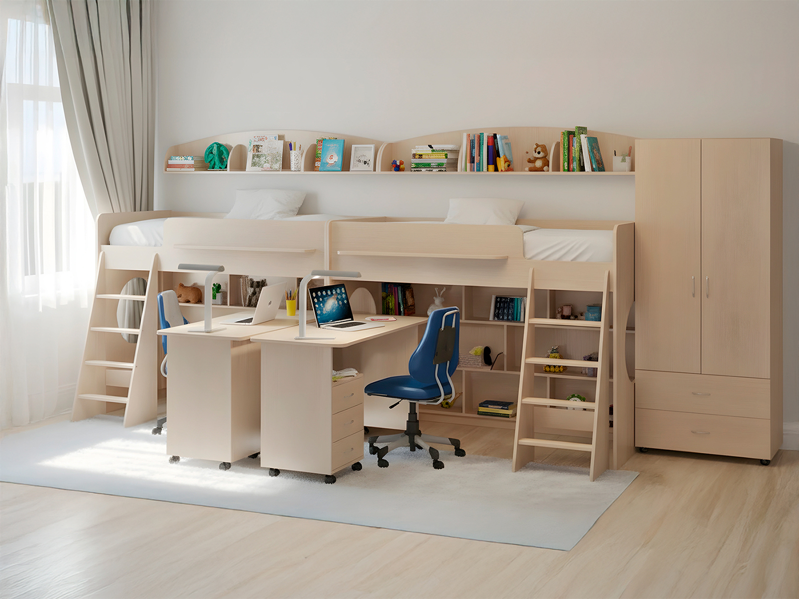 - Две кровати с большим спальным местом 180х80 см. Маленькая полочка на верхнем бортике удобна для мелочей. Под спальным местом располагается игровая зона – свой уголок для ребенка. Световые окна - дополнительное освещение, элемент для игры и возможность родителям наблюдать за ребенком.