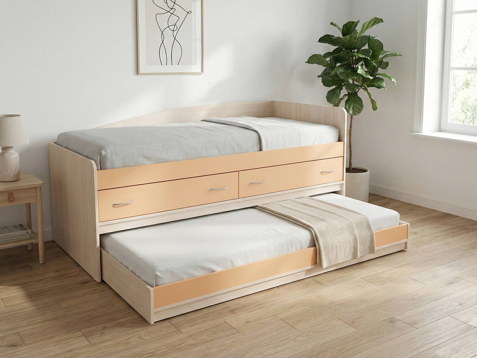 Благодаря выдвижной конструкции нижней кровати на прорезиненных колесах, днем пространство остаётся свободным для игр и занятий, а вечером трансформируется в полноценное спальное место. Между ярусами предусмотрены два вместительных ящика для хранения игрушек, постельного белья или одежды. Кровать выполнена из ЛДСП с прочным основанием из реек, что гарантирует безопасность и долговечность использования. Цвет кромки на фасадах — светло-бежевый, гармонирует с любым декором.