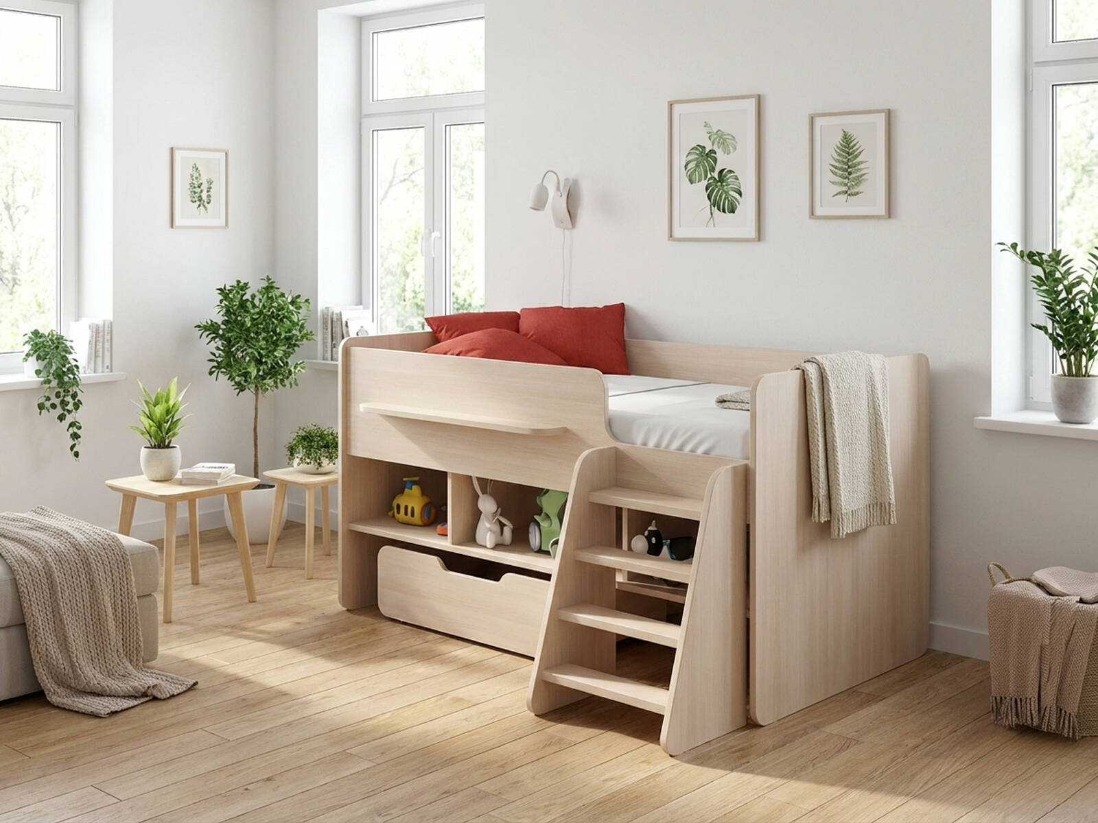- В комплекте: полка, стеллаж для книг, выкатной ящик для игрушек, лестница