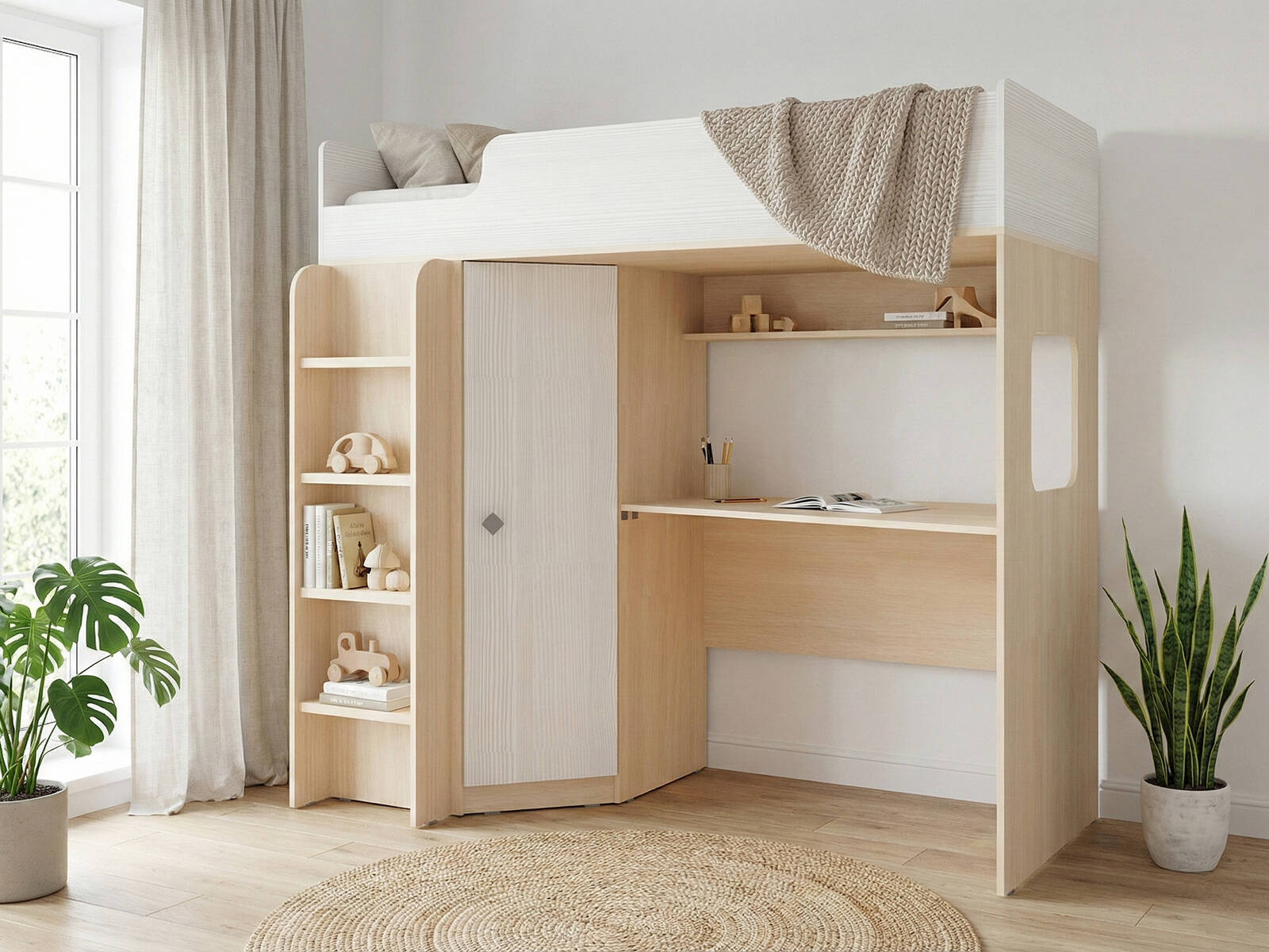 Кровать-чердак КарИВи Л-B605.41 отлично впишется в современные, скандинавские и минималистичные интерьеры. Для создания гармоничного пространства рекомендуем дополнить комнату мягким ковром, яркими декоративными подушками или пуфом. На полках можно разместить книги, коробки для хранения или предметы декора. Рабочее место удобно организовать настольной лампой и органайзерами для канцелярии, а шкаф дополнить текстильными коробами или корзинами.