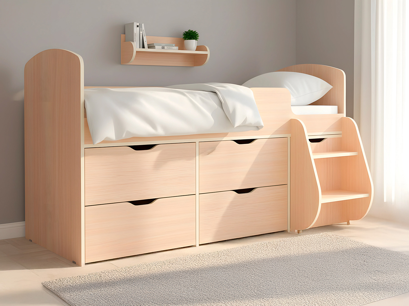 Модель Малыш 7 имеет поднятое на некоторую высоту спальное место, за что такую конструкцию принято называть кроватью-чердаком. Кровати-чердаки — одни из самых популярных вариантов обустройства детской спальни как у детей, так и у родителей.