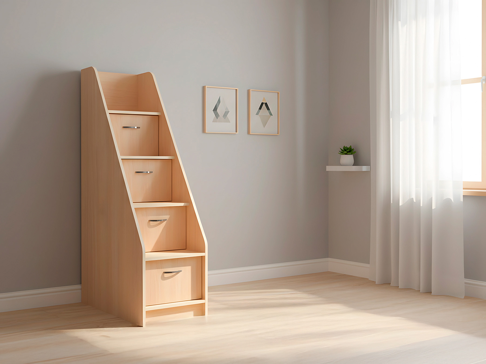 Предназначен для подъема на верхний ярус и хранения игрушек или одежды. Конструкция состоит из 4-х ступеней с ящиками, три из которых являются выдвижными, верхний - с открывающейся в сторону дверкой. Лестница является стационарным элементом.