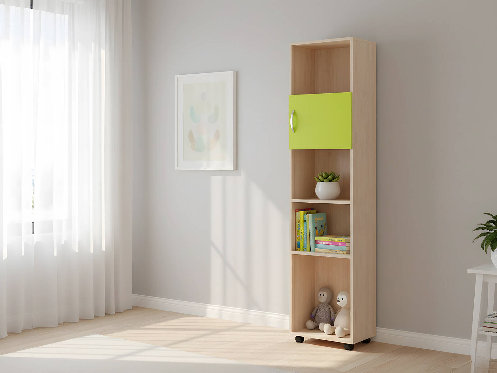 Стеллаж Л-01 отлично впишется в современные, минималистичные, скандинавские и детские интерьеры, а также станет удачным выбором для организации пространства в офисе или учебной зоне.