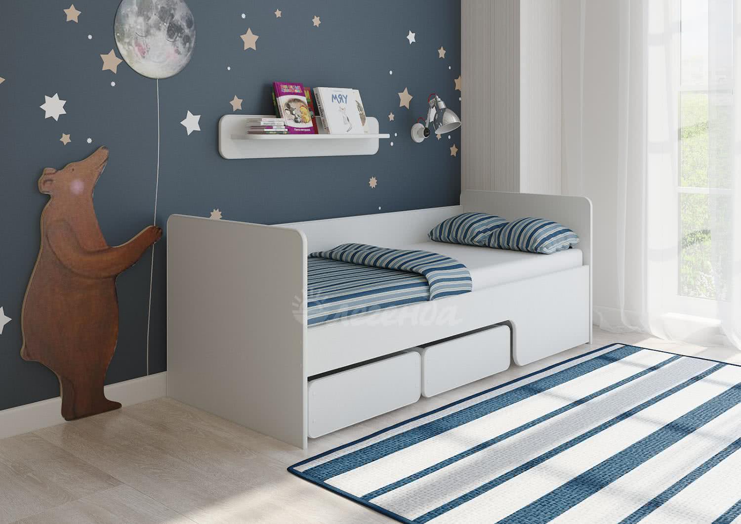 Вариант «Диванчик»: сплошной бортик устанавливаем наверх как спинку, а бортик с выемкой оставляем внизу, освободив пространство с одной стороны. - В комплект входят два удобных ящика на колёсиках. Отличные помощники в решение вопроса хранения игрушек и других вещей. Ящики идеально помещаются под фигурный бортик в вариантах «Тахта» и «Диванчик», а если бортик поднят наверх – остается свободное пространство, которое можно использовать по вашему усмотрению.