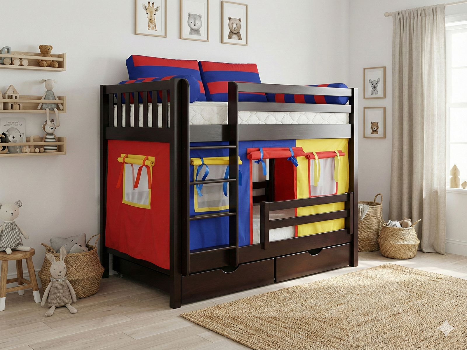 - Яркие текстильные элементы создают атмосферу игры и уюта.