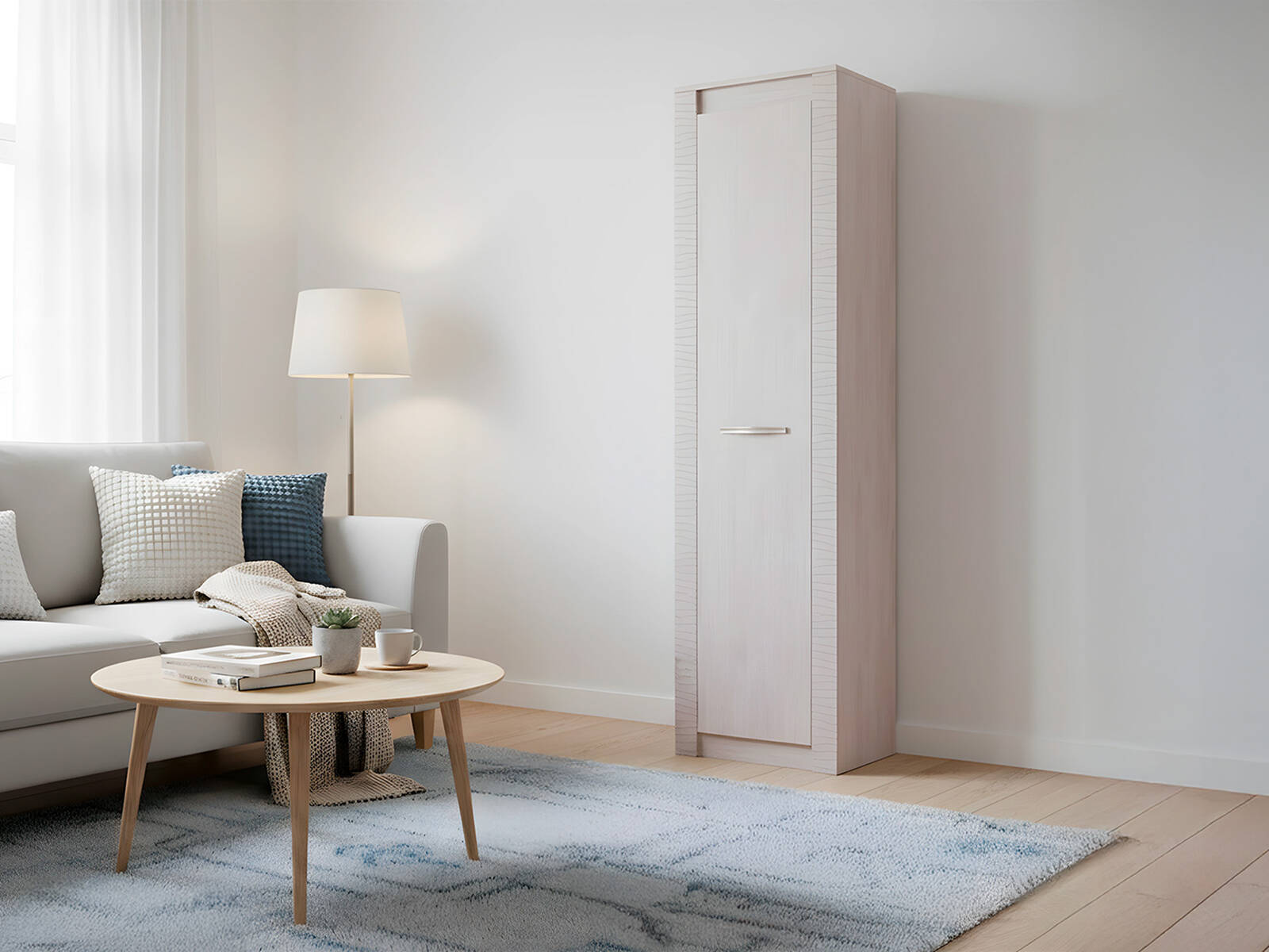 - Высота шкафа — 2200 мм, глубина — 510 мм, ширина — 562 мм: узкая форма идеально подходит для небольших комнат и ниш.