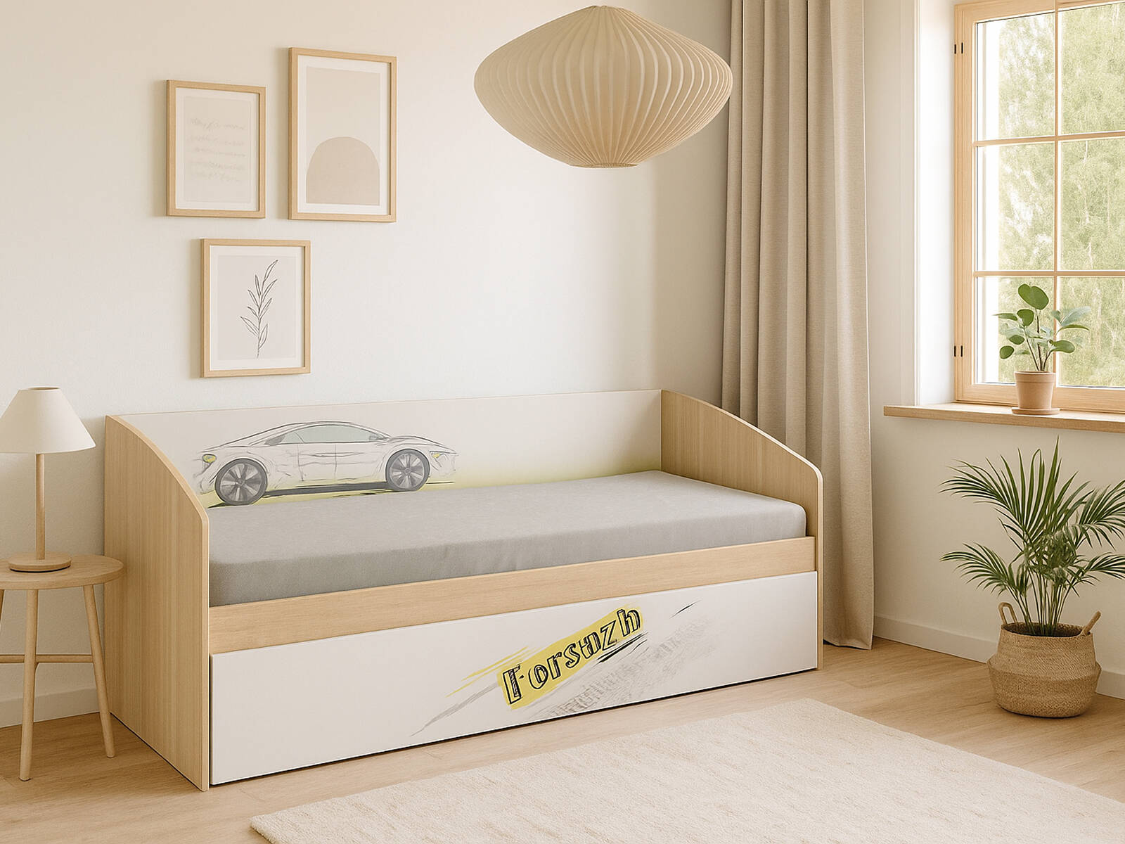 - Современный дизайн с автомобильной тематикой — идеально для детской или подростковой комнаты