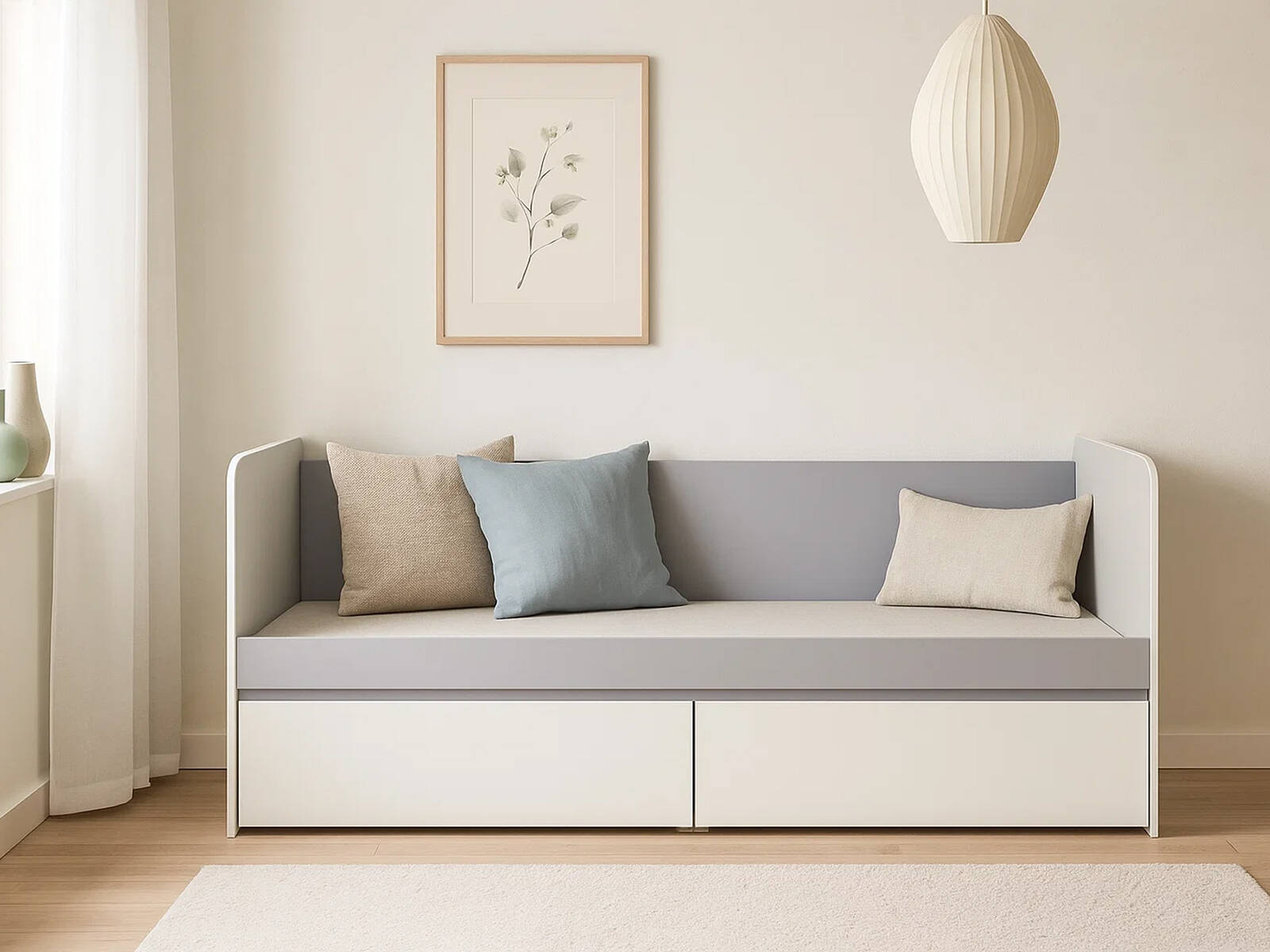 Кровать отлично смотрится с декоративными подушками, пледами, лампами с мягким светом и небольшими прикроватными столиками. Для организации системы хранения используйте корзины или коробки внутри ящиков. Модель гармонирует с мебелью в светлых тонах, деревянными элементами, коврами с коротким ворсом и аксессуарами в пастельной гамме. Подходит для создания уютной зоны отдыха, игровой или места для гостей.