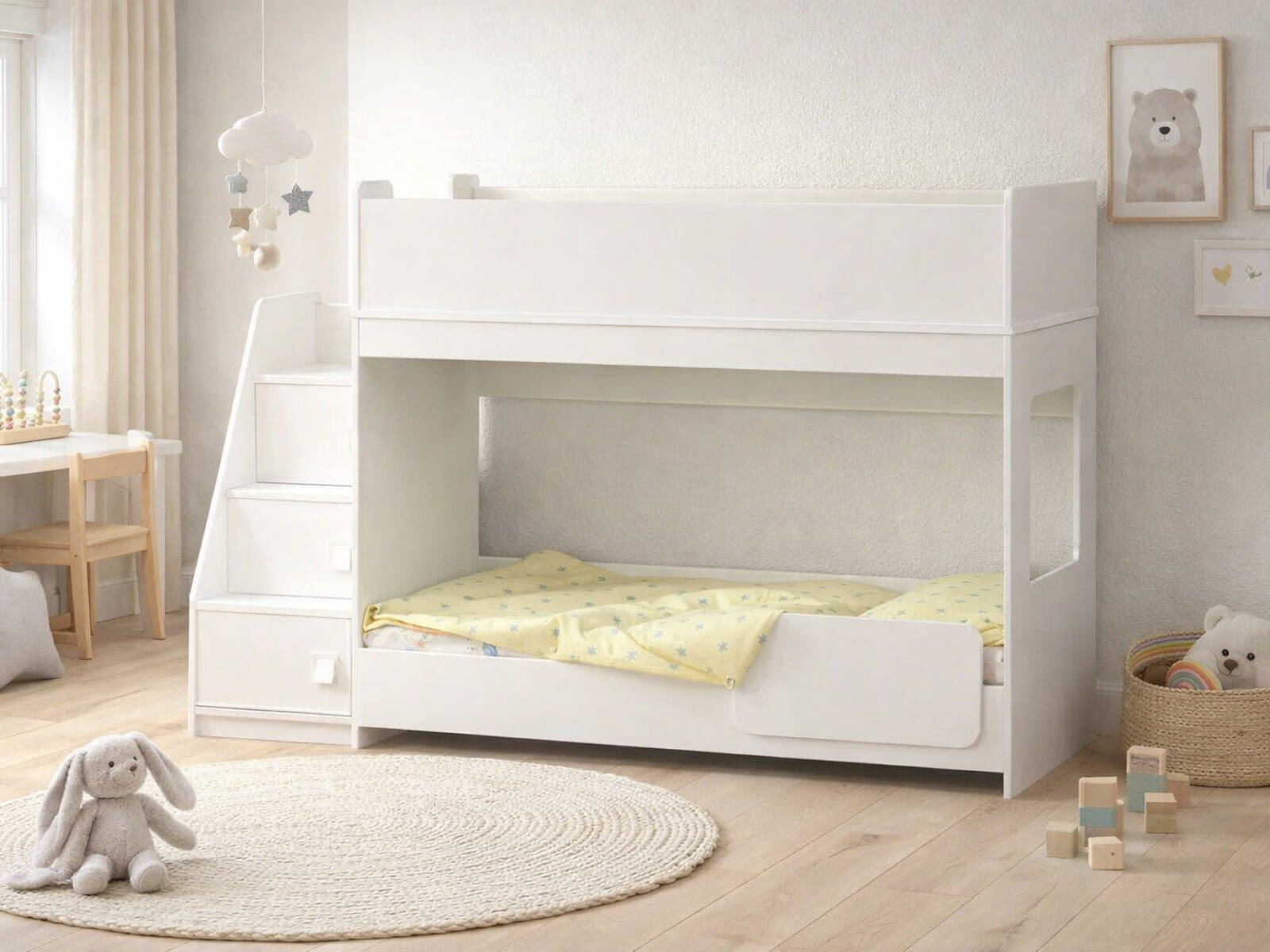 Нижний ярус расположен на высоте всего 230 мм от пола, что позволяет очень маленькому ребенку комфортно забираться и слезать с кроватки. В торцах модуля двухъярусной кровати расположены световые окна, что даст дополнительное естественное освещение.