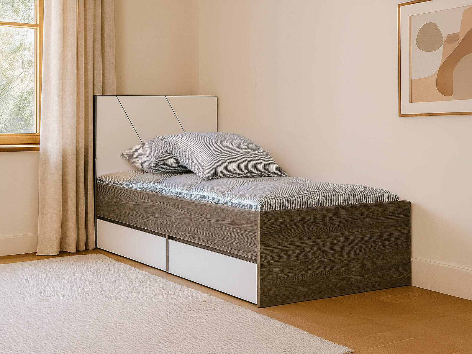 Благодаря спальному месту 90х200 см кровать отлично подойдет для подростка, гостевой или компактной городской квартиры. Модель оснащена прочным основанием на ламелях, что обеспечивает хорошую поддержку матраса и комфортный сон. Корпус выполнен из ЛДСП, фасады — из МДФ, что гарантирует долговечность и устойчивость к износу. Под кроватью расположены вместительные выдвижные ящики — идеальное решение для хранения постельного белья, сезонной одежды или игрушек без лишних затрат места.