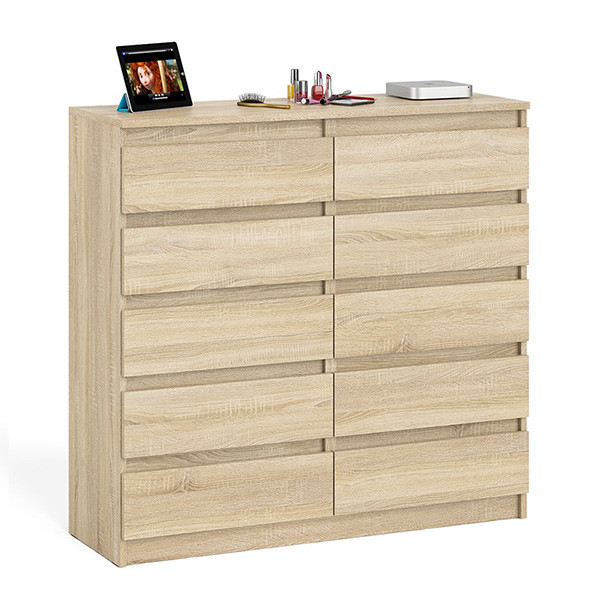 Комод оборудован десятью выдвижными ящиками, расположеными по пять в два ряда.