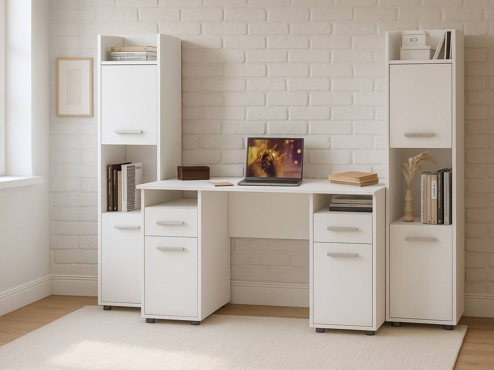 - На открытых полках удобно хранить книги, папки и элементы декора, а закрытые отделения скроют все лишнее от глаз.