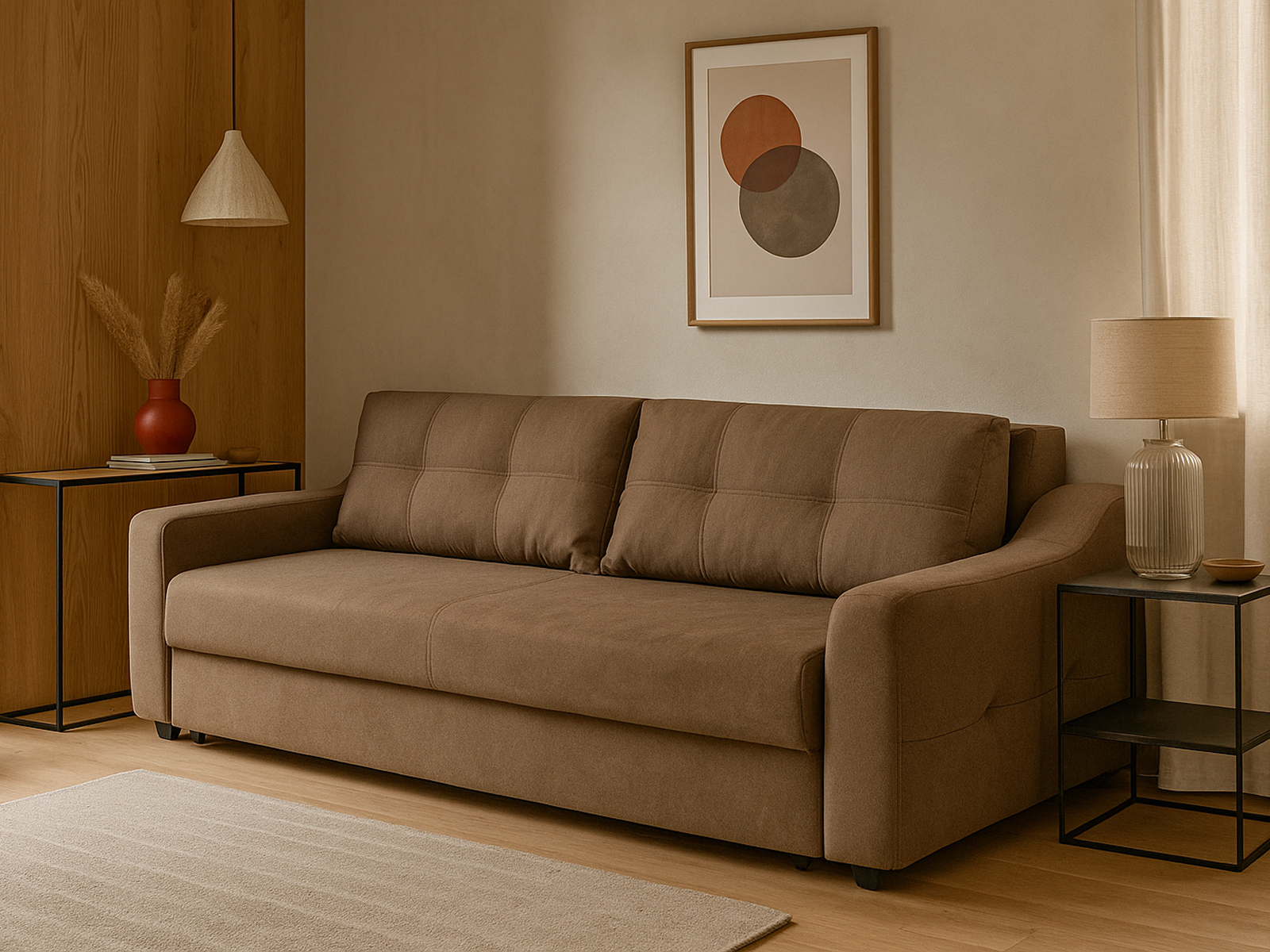 Диван отлично смотрится в просторных гостиных и уютных квартирах-студиях. Подчеркните стиль композиции с помощью журнального столика в темных тонах или минималистичных светильников. Добавьте декоративные подушки, пледы или ковры — и создайте индивидуальное пространство для отдыха. Диван прекрасно сочетается с мебелью в натуральных оттенках дерева, черными металлическими элементами и текстильными аксессуарами.