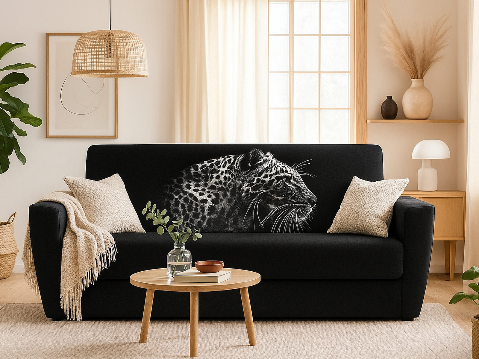 Диван-книжка Гепард 1 (боковины амстердам) от бренда FotoDivan — это эффектное решение для современной гостиной, спальни или молодежной комнаты. Ярким акцентом служит фотопринт с силуэтом гепарда на черной обивке, который добавляет интерьеру индивидуальности и динамики. Прямые лаконичные формы, боковины в стиле «амстердам» из экокожи и универсальный темный цвет делают этот диван уместным как в минималистичных, так и в креативных пространствах.