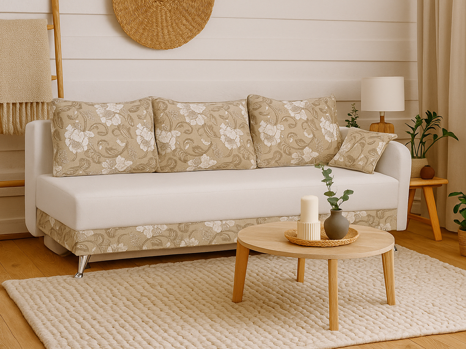 - Стильное оформление — светлый диван отлично сочетается с натуральным деревом, текстилем в пастельных тонах, журнальными столиками в сканди или эко-стиле, плетёными корзинами и комнатными растениями.
