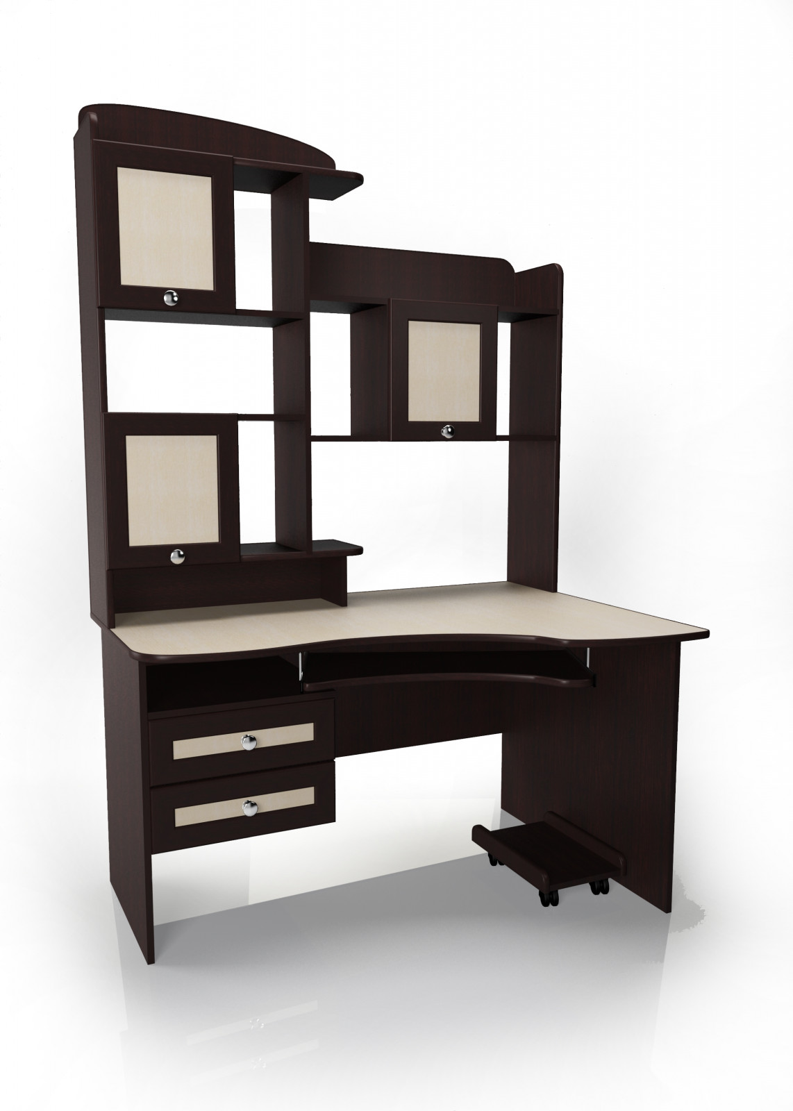 Стол выполнен из прочного ЛДСП (16 мм) с фасадами на рамке МДФ и кромкой из ABS-пластика, что обеспечивает долговечность и устойчивость к ежедневному использованию. Контрастное сочетание темного корпуса и светлых фасадов придает модели стильный, строгий и универсальный вид. Высокая надстройка с закрытыми и открытыми секциями позволяет удобно разместить книги, документы, аксессуары и элементы декора. Два вместительных выдвижных ящика и дополнительная ниша обеспечат порядок на рабочем месте, а выдвижная полка под клавиатуру и подставка на колесиках для системного блока сделают работу за компьютером максимально комфортной.