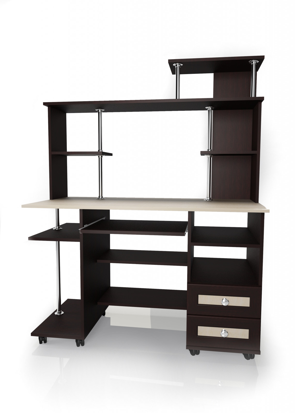 Компьютерный стол Мебелайн-24 от бренда Mebelain — это современное решение для организации рабочего пространства как в домашнем кабинете, так и в офисе. Благодаря продуманной конструкции с множеством открытых полок и двумя выдвижными ящиками стол позволяет удобно разместить компьютер, периферию, книги, папки и аксессуары. Столешница светлого оттенка гармонично сочетается с тёмными элементами корпуса, а хромированные опоры и декоративные вставки на ящиках придают модели стильный и актуальный вид.