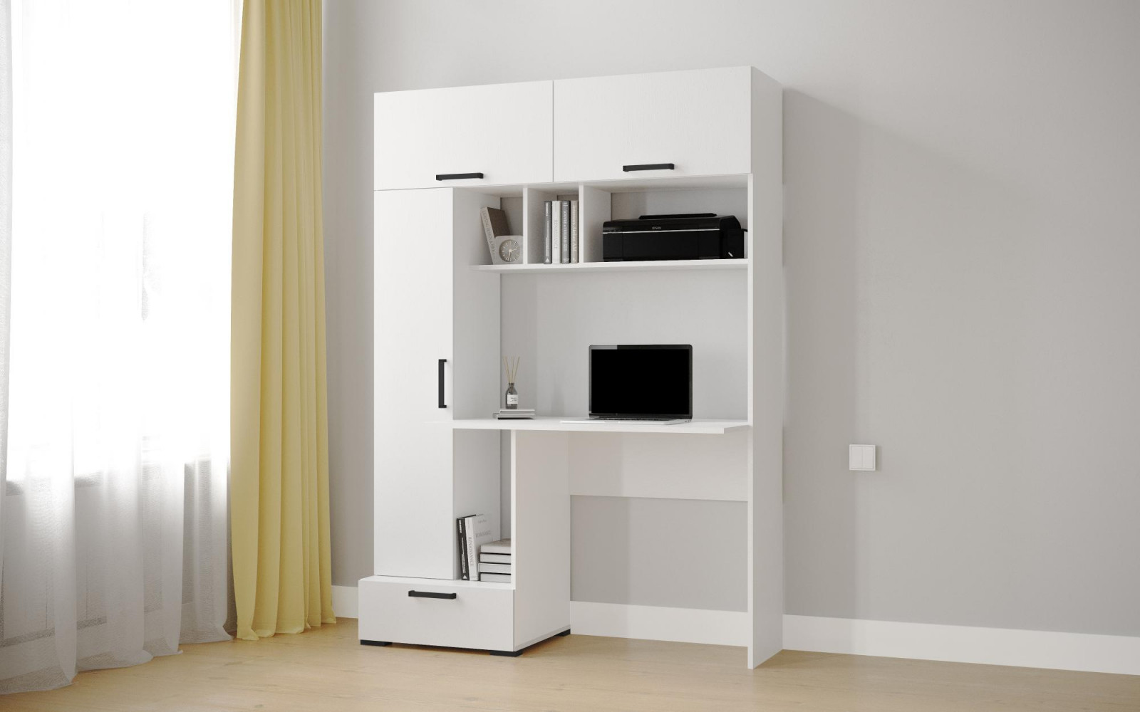 Благодаря компактной ширине и высокой конструкции, стол занимает минимум места, оставаясь вместительным. Верхние закрытые секции подходят для хранения документов, канцелярии или техники. Открытые полки отлично подойдут для книг, декора или оргтехники, а выдвижной ящик поможет поддерживать порядок на рабочем месте. Эргономичная столешница обеспечивает комфортную работу за компьютером и достаточно пространства для аксессуаров.