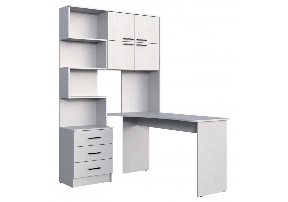 Компьютерный стол Woodville Эльброни правый, белый — современное решение для организации рабочего пространства дома или в офисе. Стол выполнен в лаконичном светлом цвете и оснащён вместительной системой хранения: открытые полки, три выдвижных ящика и верхние шкафчики с матовыми фасадами позволяют удобно разместить книги, канцелярские принадлежности, документы и предметы декора.