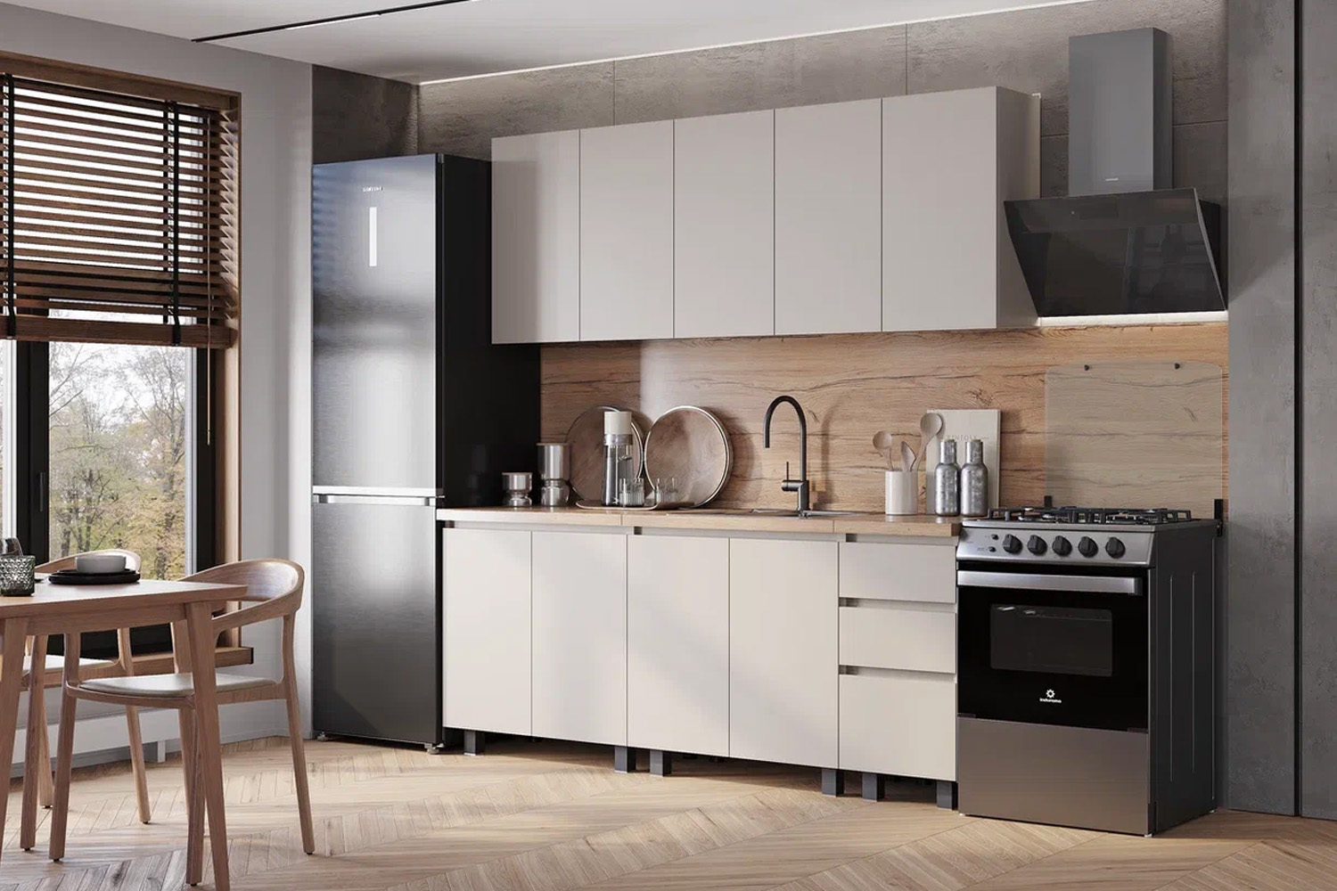 Гарнитур BTS Chester 2,0 м — выбор для тех, кто ценит лаконичность, уют и практичность в доме. Отлично впишется в квартиры-студии, современные городские кухни и небольшие помещения, где важна каждая деталь.