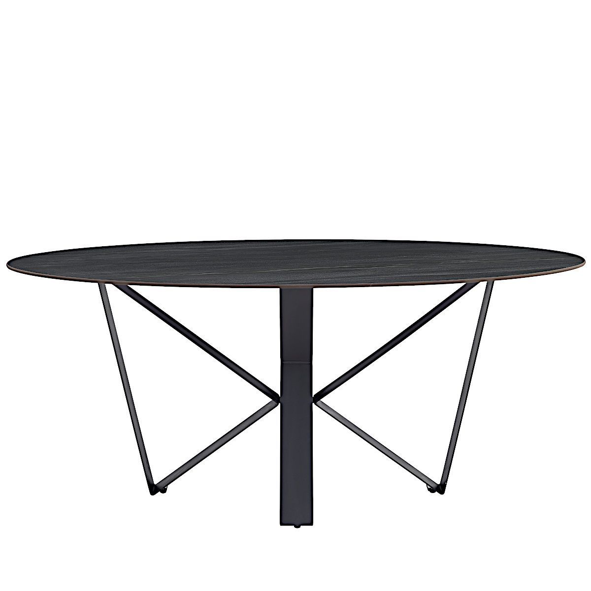 Обеденный стол La Alta DT555 — эффектное решение для современной кухни или столовой, где важны стиль и удобство. Овальная столешница из монолитной керамики толщиной 12 мм смотрится элегантно и минималистично, а необычные металлические опоры с графичной геометрией придают столу характер и устойчивость. Чёрная поверхность столешницы с матовой текстурой напоминает природный камень, легко сочетается с разными вариантами декора и мебели.
