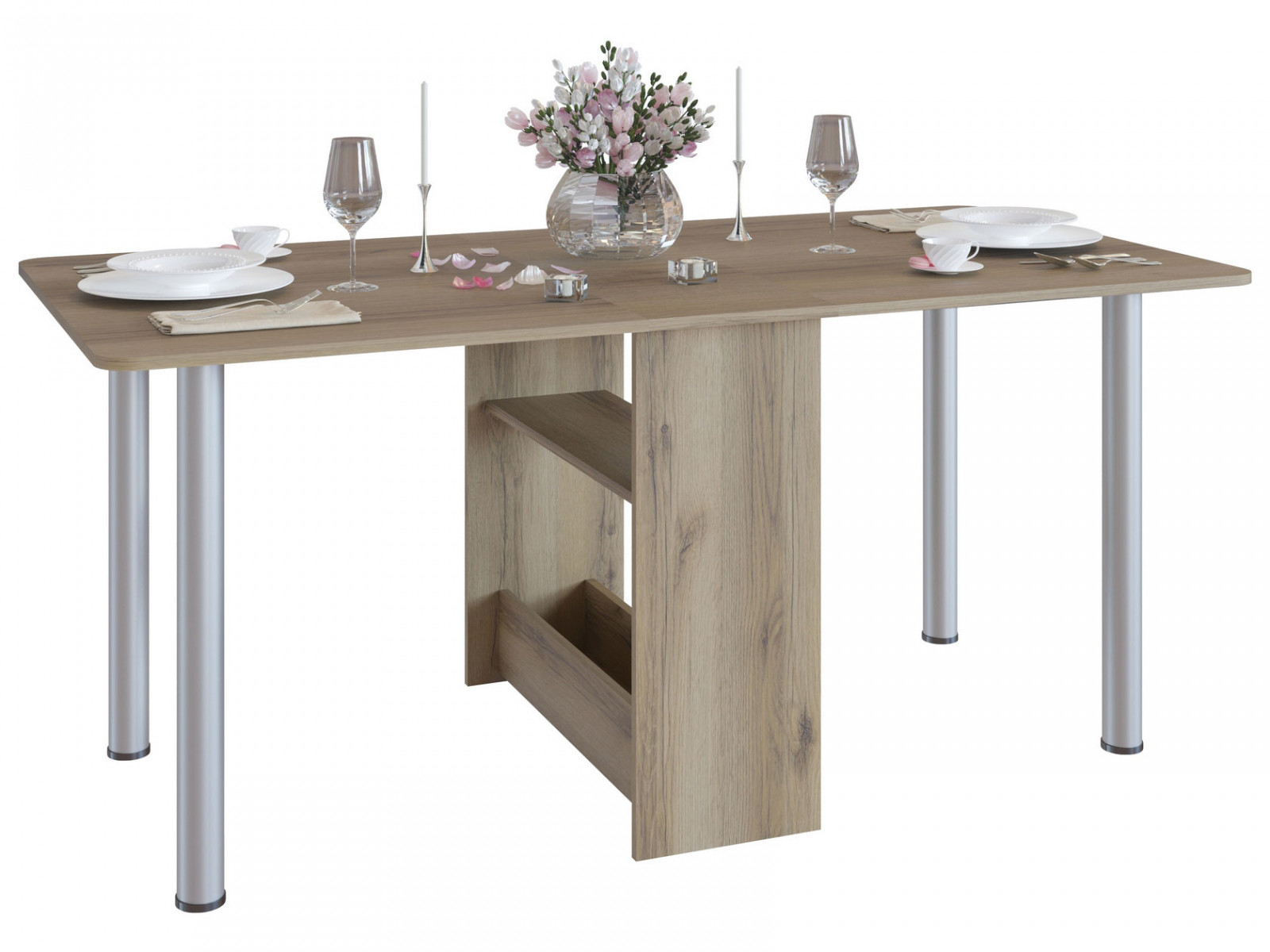 Стол-книжка СП-04М.1 подойдет для ограниченного пространства. Модель легко превращается из небольшой тумбы в широкий вместительный стол, а если гостей ожидается не очень много, его можно разложить наполовину. Металлические опоры обеспечивают устойчивость конструкции. В сложенном виде их удобно хранить в специальном ящике внутри стола.