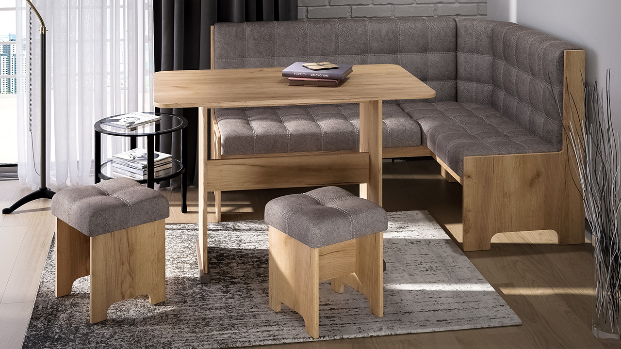 Кухонный уголок ТриЯ Флорида — это современное и удобное решение для создания уютной обеденной зоны даже на небольшой кухне. Компактная угловая скамья с мягкой обивкой из микровелюра, стол и два табурета гармонично сочетаются между собой и легко впишутся в любой интерьер. Лаконичный дизайн с акцентом на натуральные текстуры корпуса из ЛДСП делает уголок универсальным для классических, скандинавских или современных кухонь.