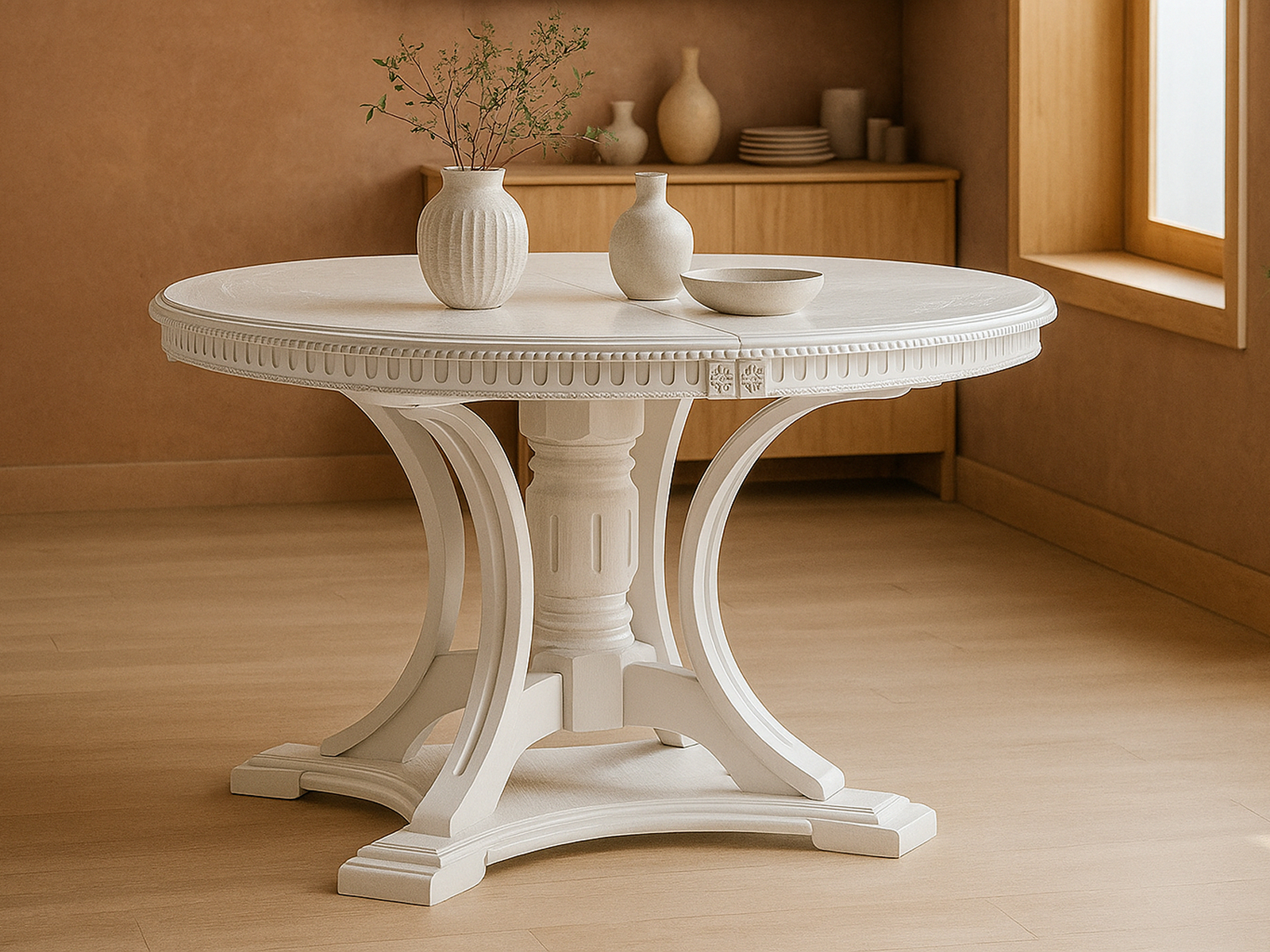 Стол Woodville Нозеан Серебро/Белый — это изысканное сочетание классического дизайна и современной функциональности. Круглая форма и элегантная резьба по краю столешницы придают модели особый шарм, а белоснежная отделка с серебряными акцентами делает стол универсальным решением для гостиной, столовой или просторной кухни.