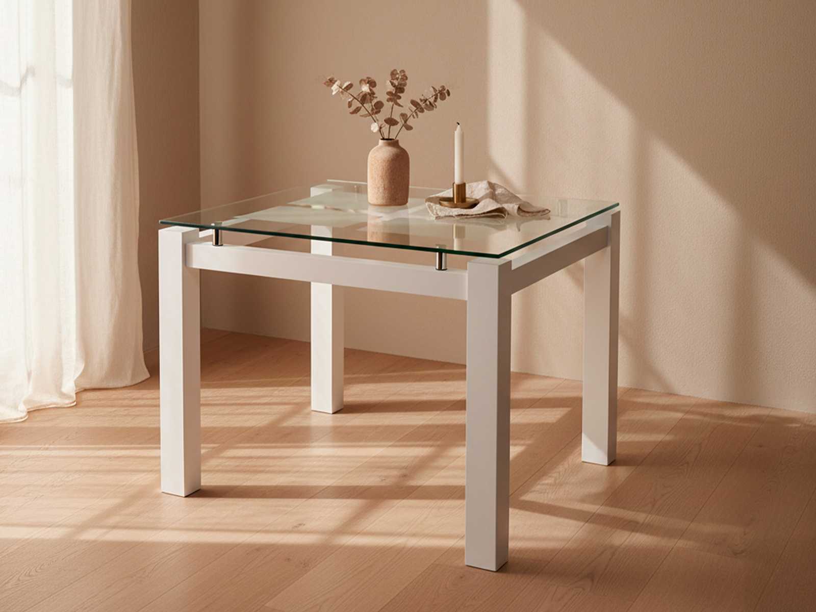 - Столешница выполнена из стекла, что облегчает уход и визуально расширяет пространство.