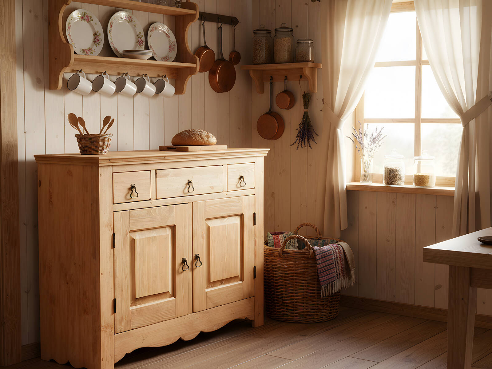 Тумба отлично подойдёт для хранения столовых приборов, скатертей, банок с домашними заготовками или кухонных аксессуаров. На верхней поверхности удобно разместить корзины с фруктами, вазы с цветами, стильные подносы или домашний декор. Для дополнительного уюта можно сочетать с плетёными коробами, текстильными салфетками и керамическими вазами. Особенно гармонично тумба смотрится рядом с деревянными столами, открытыми полками и предметами в стиле кантри или ретро.