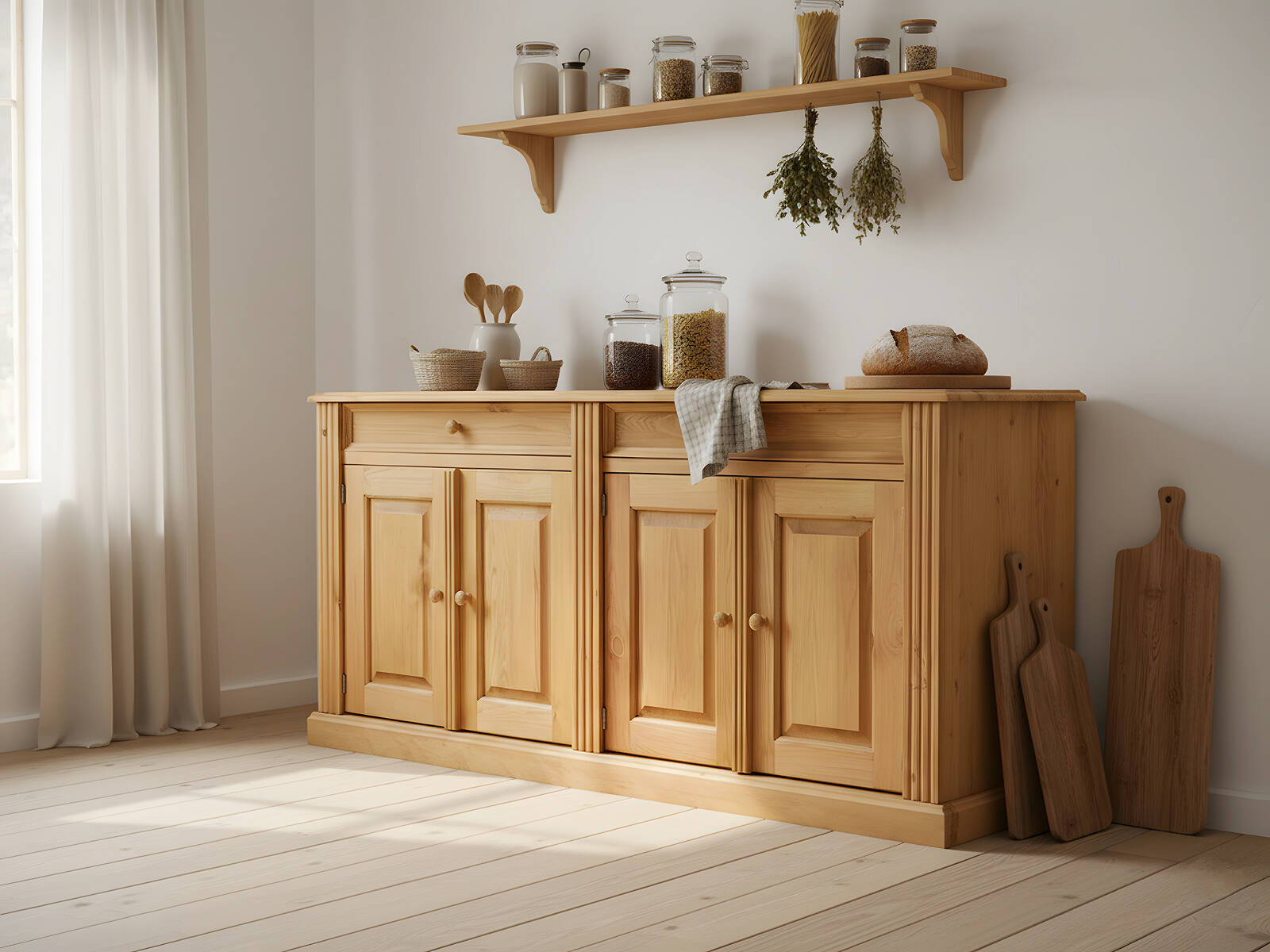 Тумба Elba 4P станет центральным элементом уютной кухни, столовой или дачной гостиной. Над ней можно повесить открытую деревянную полку для посуды или специй, а на столешницу поставить плетёные корзины, керамические кувшины, декоративные банки и разделочные доски. Эффектно смотрится в сочетании с деревянным обеденным столом, мягкими стульями в светлой обивке, уютным текстилем и живыми растениями.