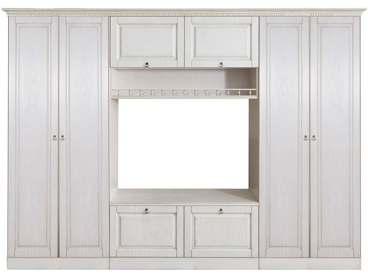 В состав комплекса входят два вместительных двухдверных шкафа для одежды и хранения, нижняя тумба с удобными ящиками для аксессуаров и текстиля, а также подвесной шкаф для дополнительного размещения вещей. Просторная ниша под телевизор (1300х400х905 мм) позволяет разместить современную технику, декорировать полку рамками с фотографиями или стильными аксессуарами. Комплект багетов завершает образ, подчеркивая классический стиль мебели.