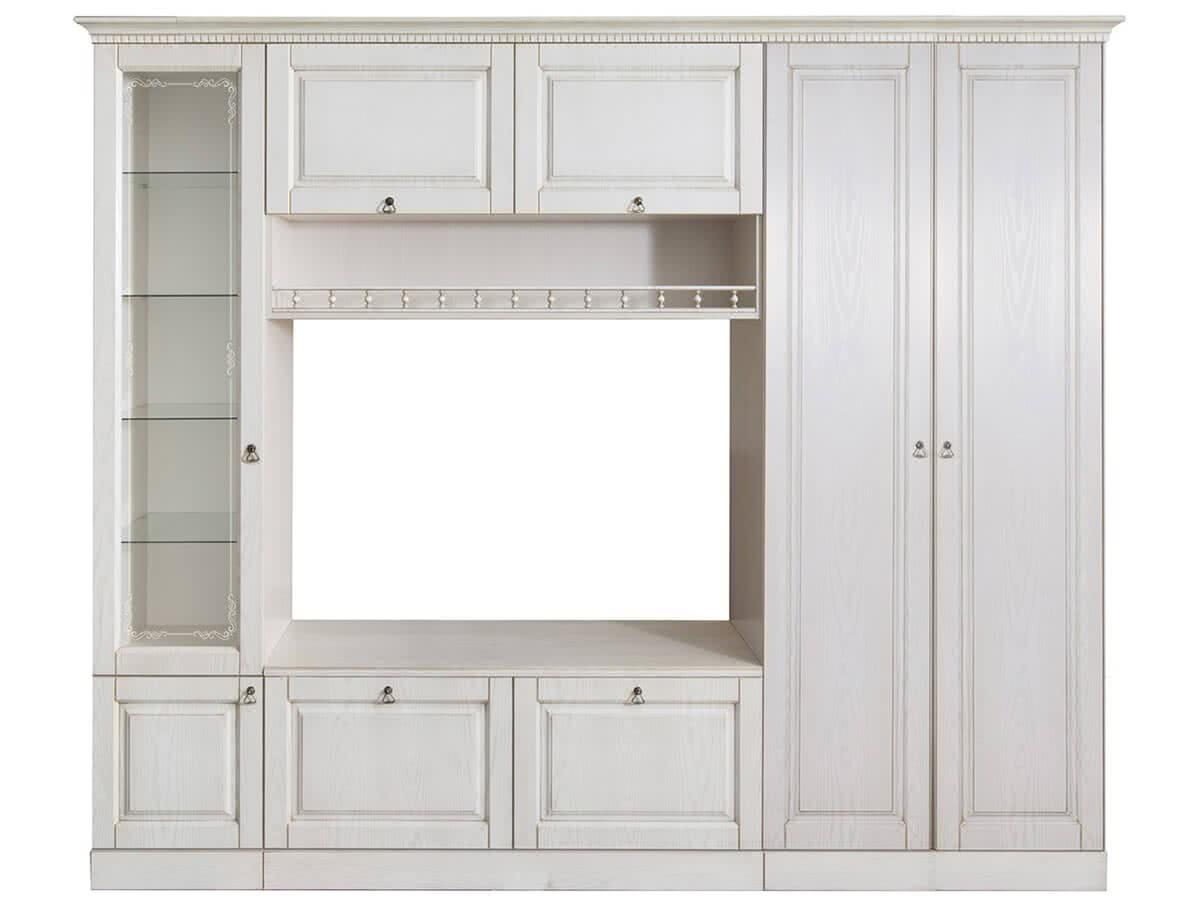 Комплект включает шкаф со стеклянными полками для эффектной демонстрации посуды или декора, вместительный двухдверный шкаф для одежды и аксессуаров, нижнюю тумбу с ящиками для хранения, подвесной шкаф для мелочей и комплект багетов, подчёркивающих изысканность композиции. Ниша под ТВ (1300х400х905 мм) идеально подходит для размещения современных телевизоров и медиаустройств.