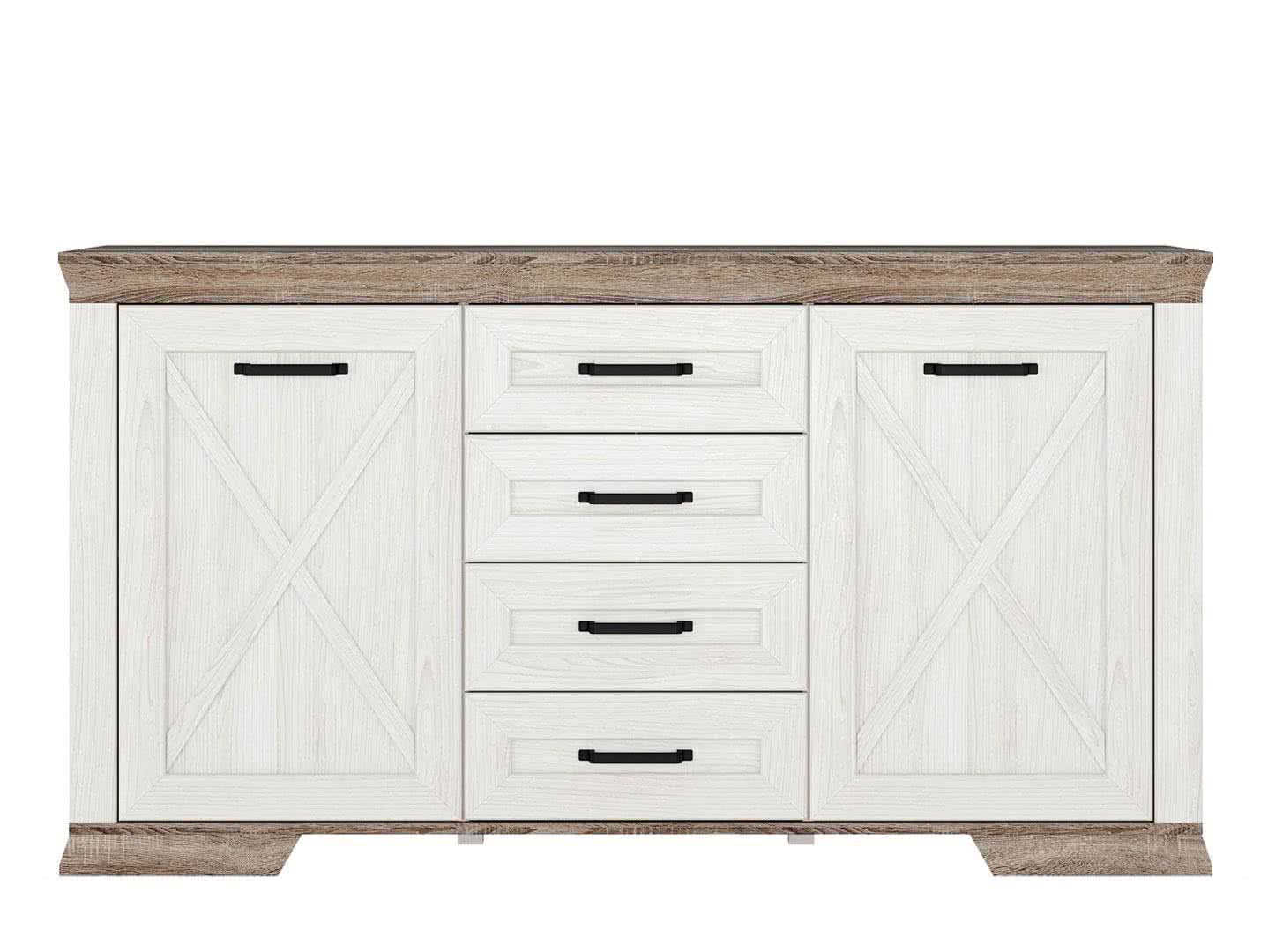 Тумба BRW Marselle KOM2D4S — это стильный и практичный элемент мебели, который гармонично впишется в современный интерьер гостиной, спальни или прихожей. Элегантное сочетание светлого корпуса с акцентной столешницей и декоративными рамками придаёт тумбе характер деревенского шика и нотки современного кантри. Фасады украшены выразительными шпросами, а черные матовые ручки подчеркивают изысканность дизайна.