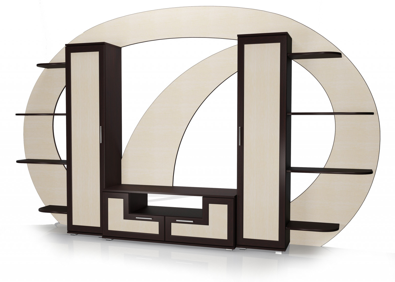 Стенка Мебелайн-12 — это готовое решение для гостиной, выполненное в современном стиле и сочетающее в себе оригинальный дизайн и функциональность. Эффектная овальная конструкция с геометрическими элементами привлекает внимание и становится центральным акцентом интерьера. Контрастное сочетание тёмных и светлых оттенков ЛДСП гармонично вписывается в современные квартиры и дома, а также отлично смотрится в офисных зонах отдыха.