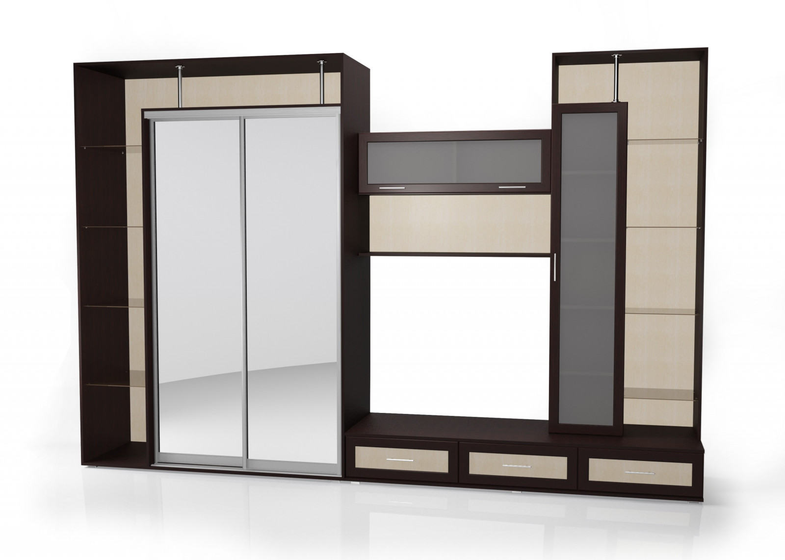 Стенка Мебелайн-16 — современное и функциональное решение для гостиной, которое сочетает в себе стильный дизайн и продуманную систему хранения. Композиция включает вместительный шкаф-купе с зеркальными фасадами, высокий пенал с матовым стеклом, открытые полки и несколько выдвижных ящиков для мелочей. Четкие линии, контраст светлых и темных оттенков, а также стеклянные и зеркальные элементы придают стенке эффектный внешний вид и визуально расширяют пространство.
