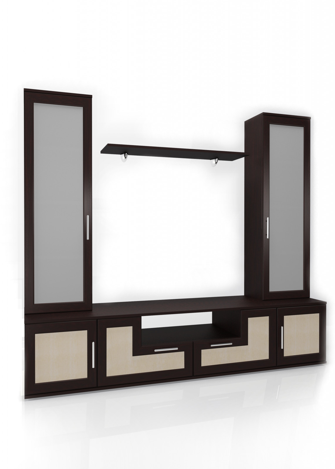 - Удобная система хранения: две высокие секции для одежды, книг или посуды, нижние отделения с закрытыми дверцами для скрытого хранения, а также центральная ниша под телевизор и полка для аксессуаров.