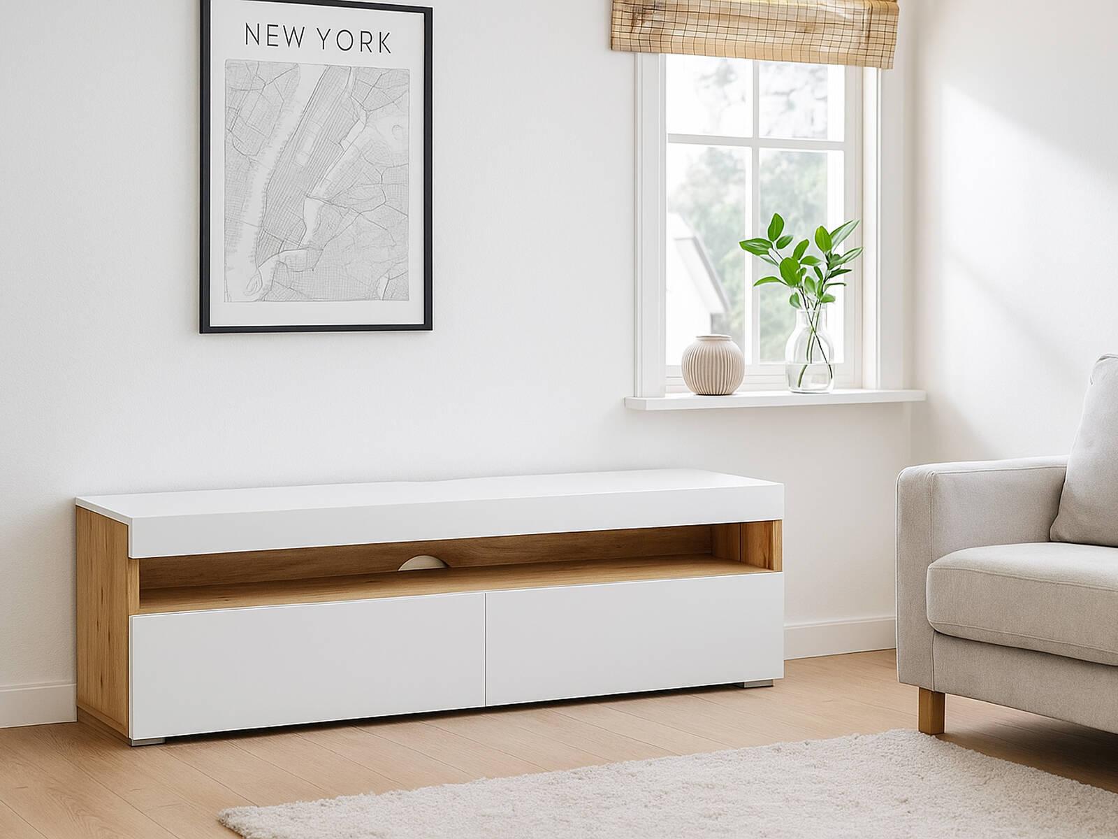 Тумба под ТВ Mobi Альба — современное решение для гостиной или спальни, сочетающее лаконичный дизайн и функциональность. Модель выполнена в светлых тонах с контрастными деревянными вставками, что визуально облегчает пространство и прекрасно вписывается в интерьеры в стиле сканди, минимализм или современная классика. Благодаря компактным размерам и низкому профилю, тумба не перегружает комнату и идеально подходит даже для небольших помещений.
