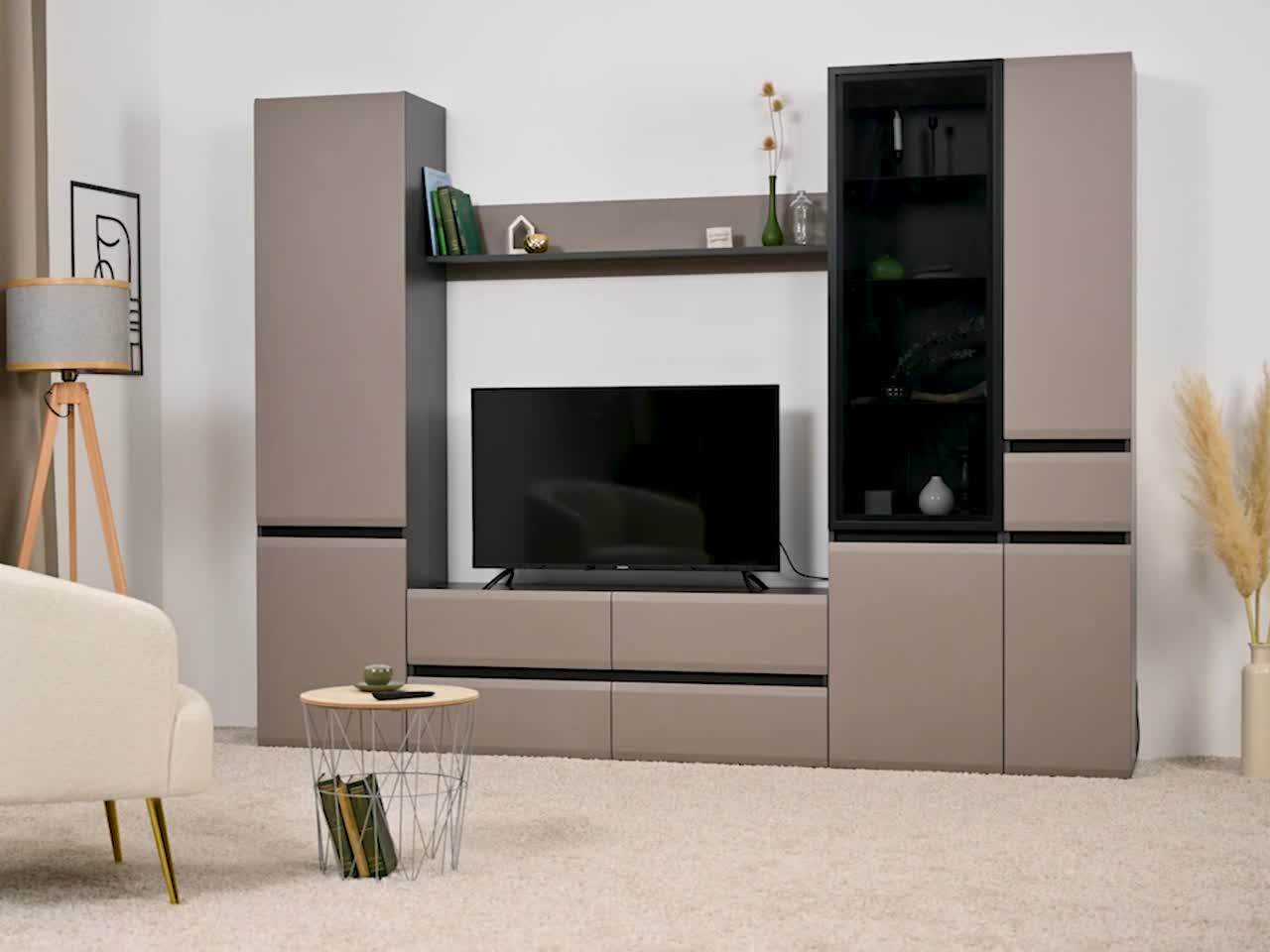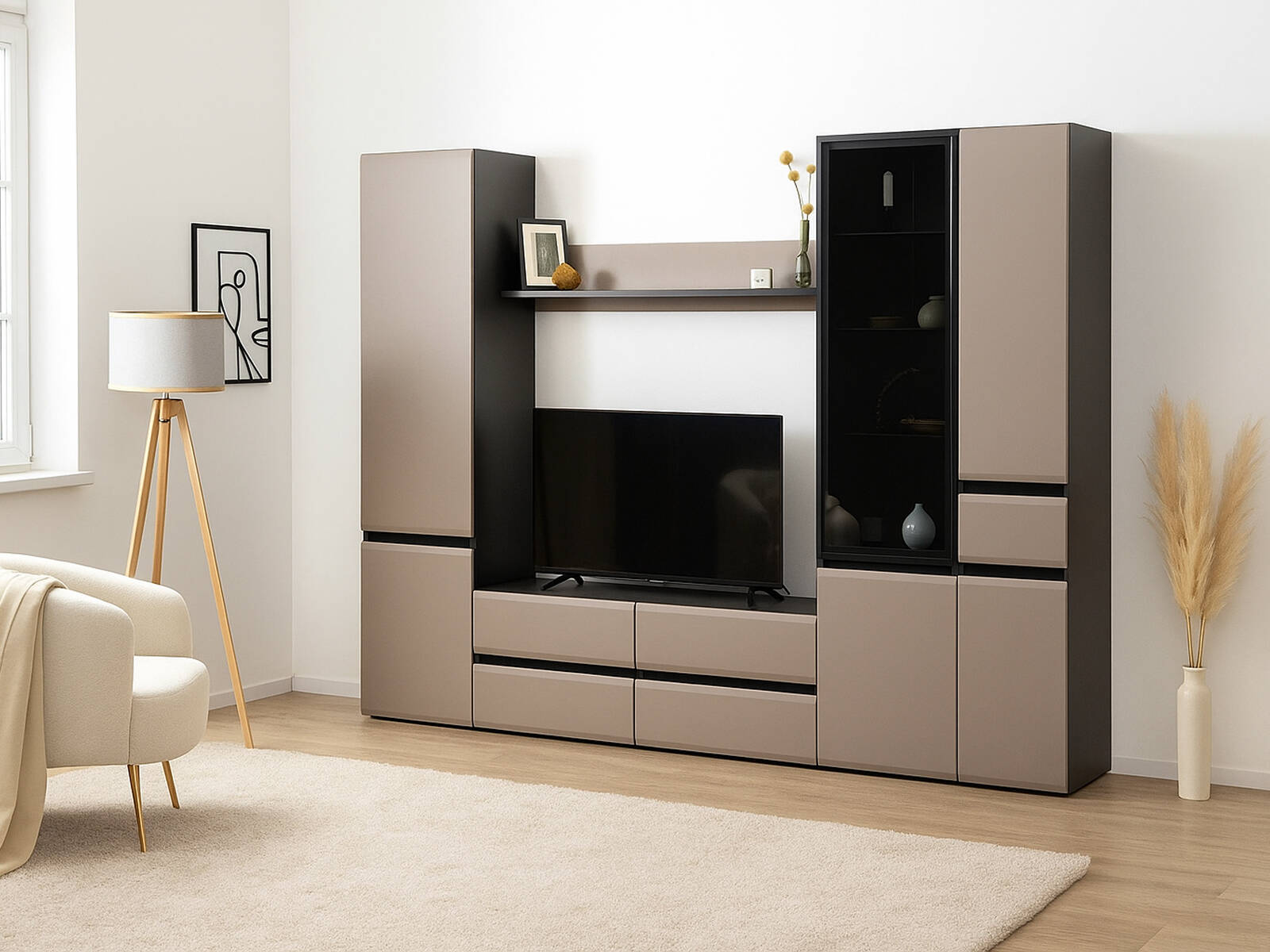 Акцентом выступают чёрные горизонтальные вставки и тонированное стекло витрины. Чёрная задняя стенка эффектно подчеркивает наполнение шкафов.