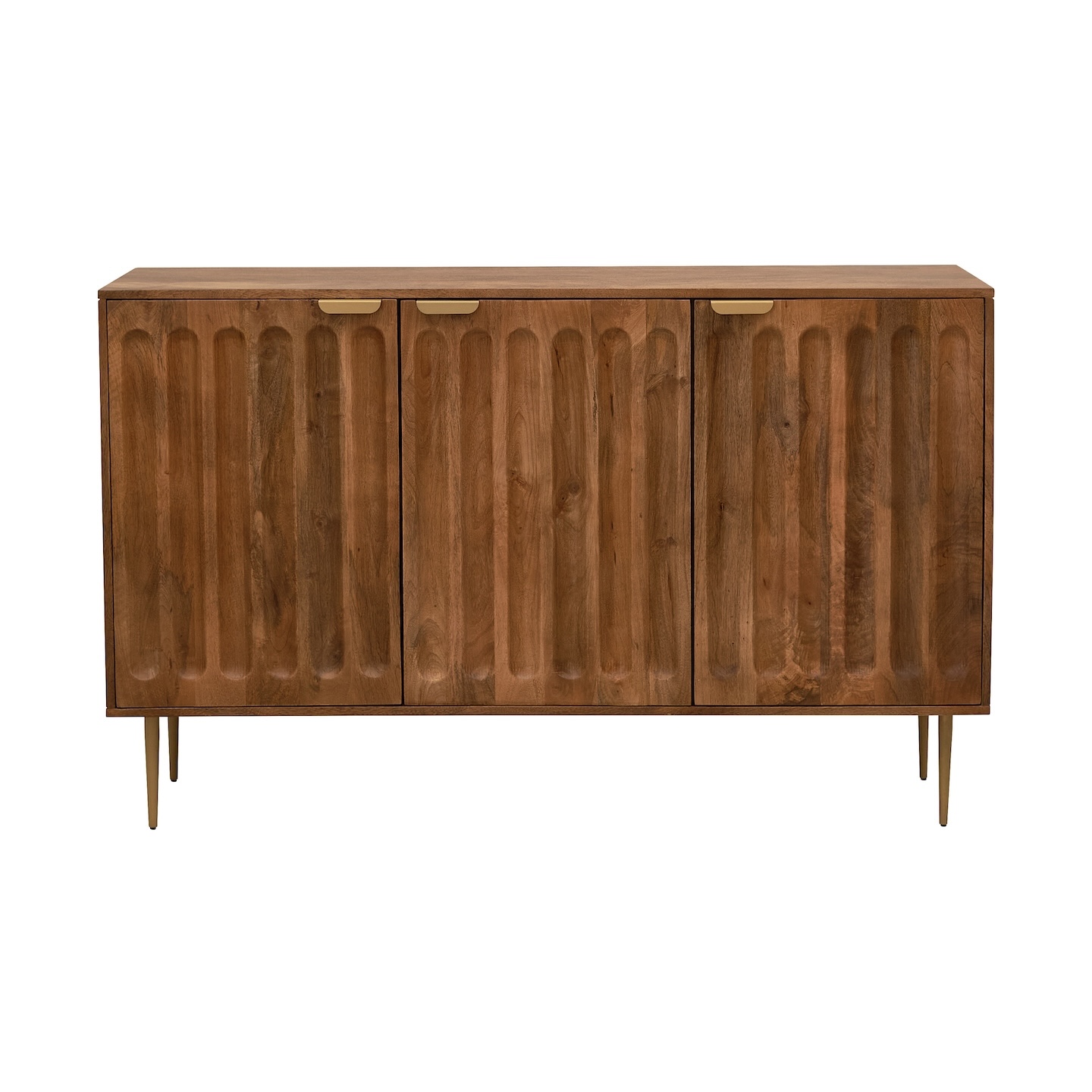 комод с 3 распашными секциями фасады фрезерованы геометрическим узором отделка выполнена с сохранением естественной структуры древесины манго приятный коричневый цвет отборная древесина манго фурнитура с холодным золотистым оттенком изящные металлические ножки