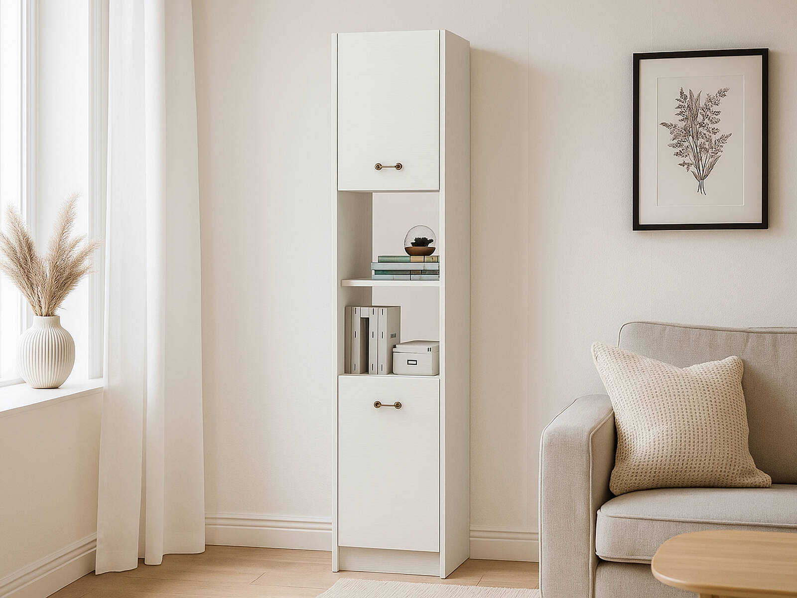 Стеллаж отлично подойдет для гостиной, спальни, детской комнаты, кабинета или прихожей. На открытой полке удобно разместить книги, сувениры, фоторамки или растения. В закрытых секциях можно хранить документы, коробки, бытовые мелочи, которые хочется скрыть от глаз. Для организации пространства используйте декоративные корзины, коробки для хранения и папки — это сделает систему хранения еще удобнее и аккуратнее. Стеллаж органично сочетается с письменными столами, современными креслами, минималистичными комодами и текстилем в спокойных тонах. Для гармоничного оформления комнаты можно подобрать журнальный столик или навесные полки в аналогичной цветовой гамме.