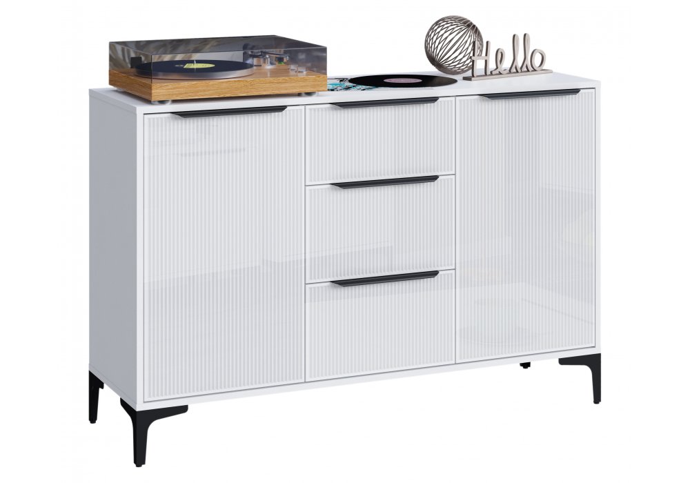 Комод сочетает две распашные дверцы и три вместительных выдвижных ящика, что обеспечивает удобную систему хранения для одежды, документов, аксессуаров или текстиля. Внутренние полки идеально подходят для коробок, корзин, книг или сезонных вещей, а гладкая поверхность позволит разместить декор — например, стильную лампу, вазу с цветами, фотографии в рамках или коллекцию виниловых пластинок.