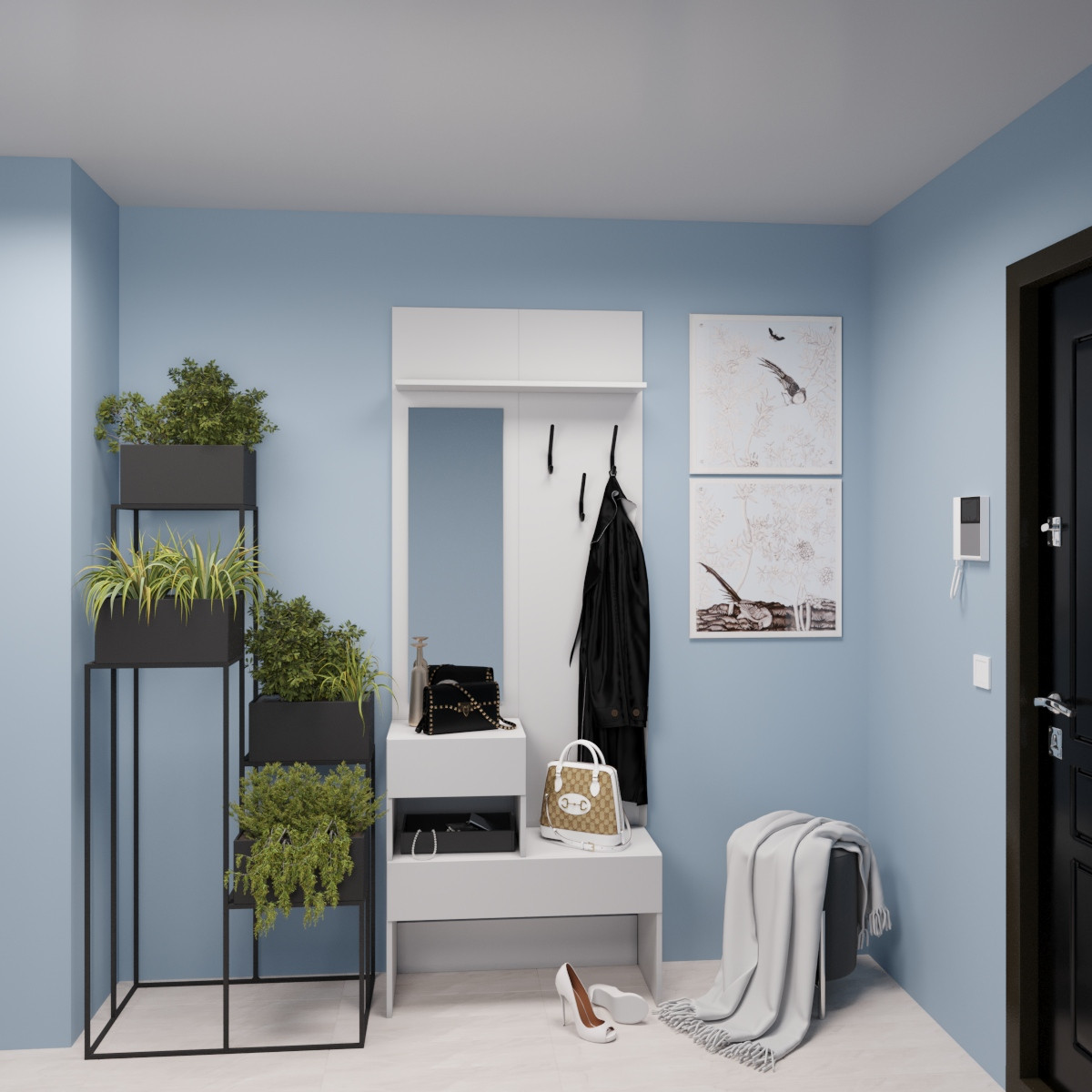В нижней части вешалки расположен выдвижной ящик на всю ширину секции с шариковыми направляющими. На панелях вешалки установлены 3 черных крючка и зеркало, а в верхней части - 2 открытые полки.
