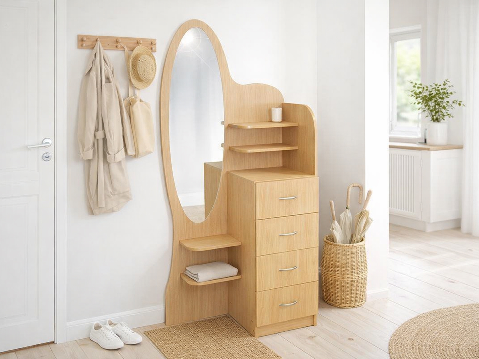 В конструкции предусмотрены четыре вместительных выдвижных ящика для хранения аксессуаров, перчаток, ключей и других мелочей, а также открытые полки для декора, сумок или повседневных предметов. Благодаря практичному материалу — ЛДСП — прихожая устойчива к износу и легка в уходе, что особенно важно для ежедневного использования.