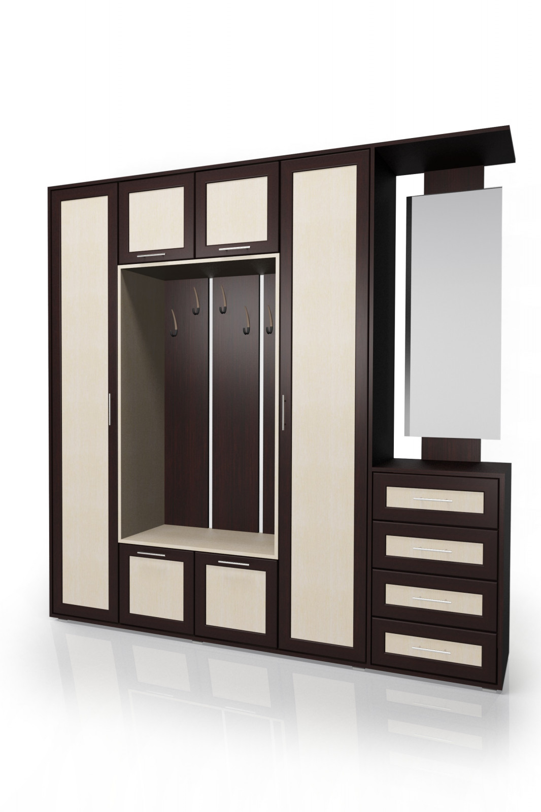 - Общая длина конструкции — 2100 мм, ширина — 400 мм, высота — 2100 мм, что делает прихожую вместительной, но не громоздкой.