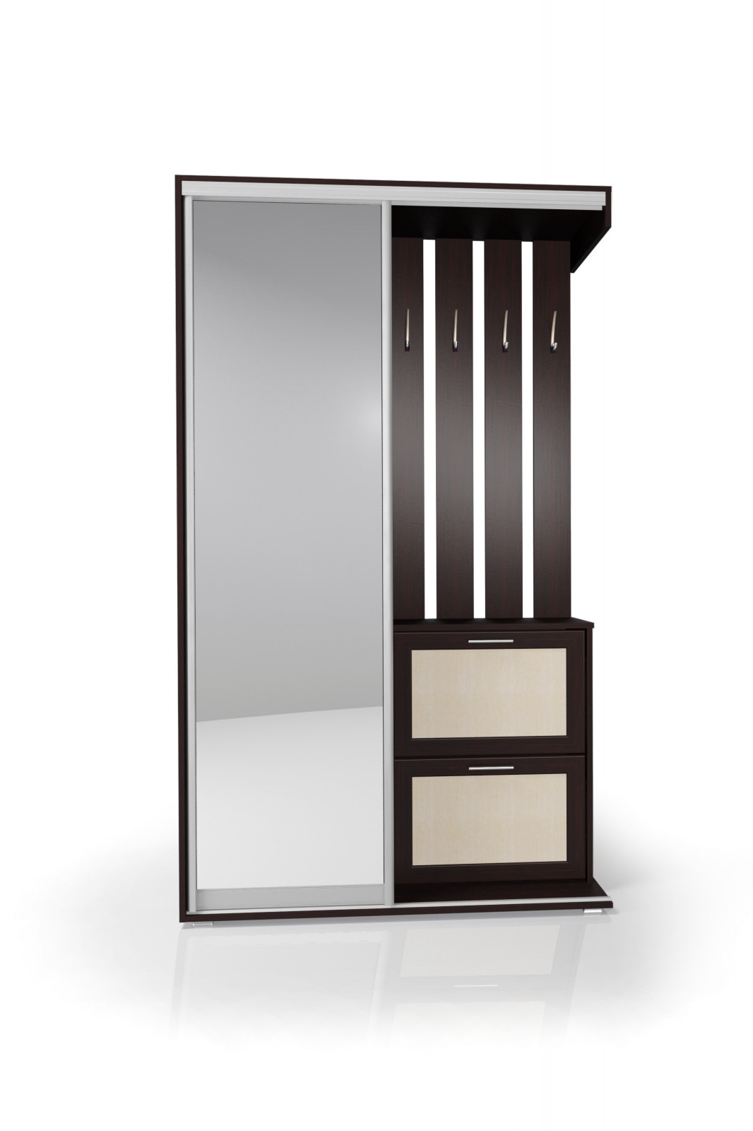 - Рамка фасада выполнена из МДФ, а большое зеркало визуально расширяет пространство и делает прихожую светлее.
