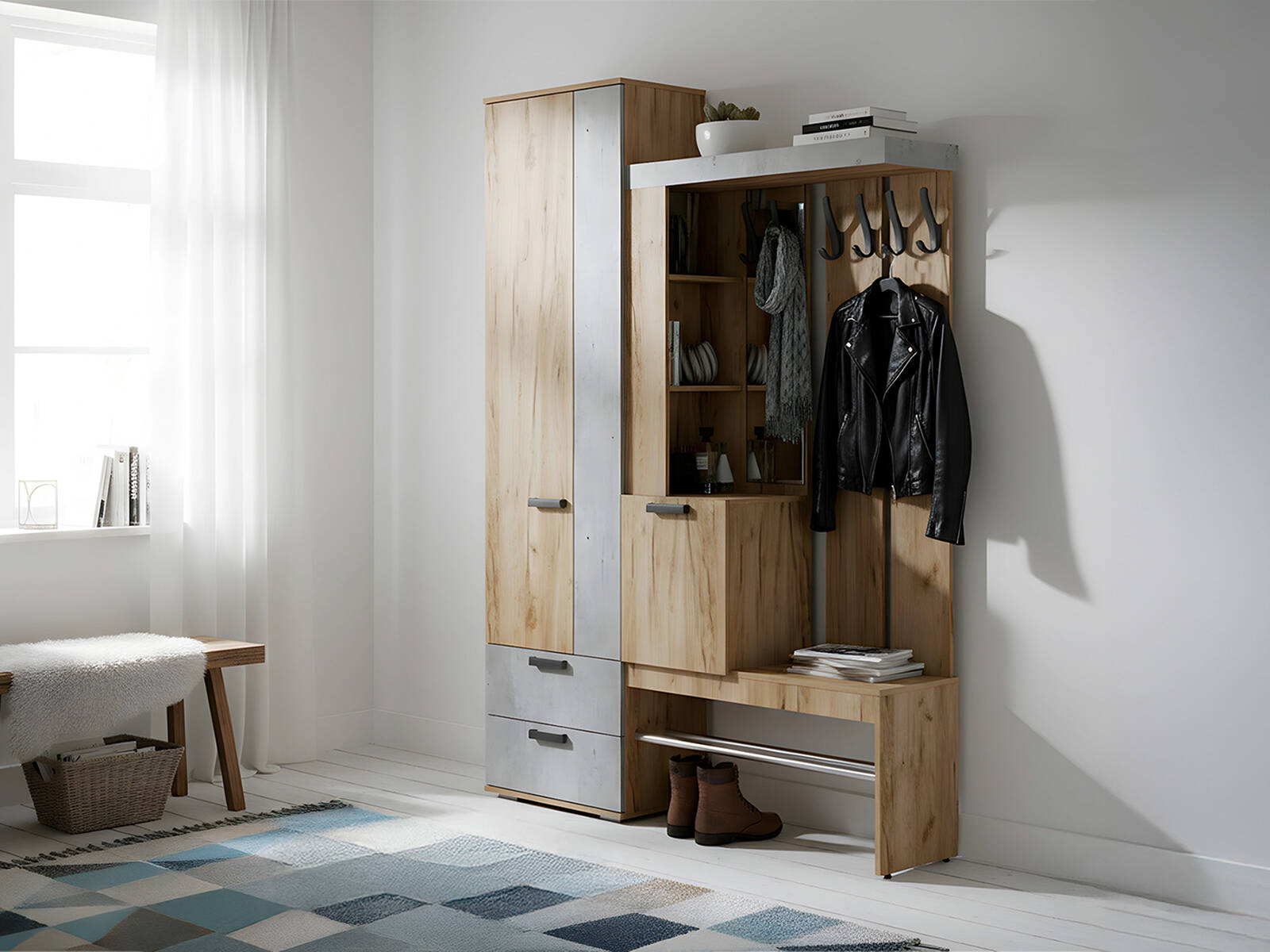 Прихожая «Трамп» вместительна и выполнена в необычном цветовом решении – Декор «Крафт»/Декор «Метрополитен Грей». Она легко впишется в небольшую квартиру, сохранив жилое пространство. Стильный дизайн, четкость и лаконичность линий, гармоничное сочетание цветов – здесь есть все, чтобы стать дополнением Вашего дома.